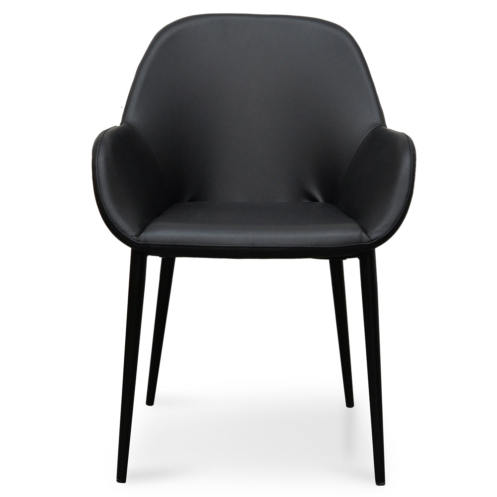 Metal frame and legs in a black powder coated finish Black PU leather upholstery Deep seat, wide backrest and curved armrests Product requires minor assembly