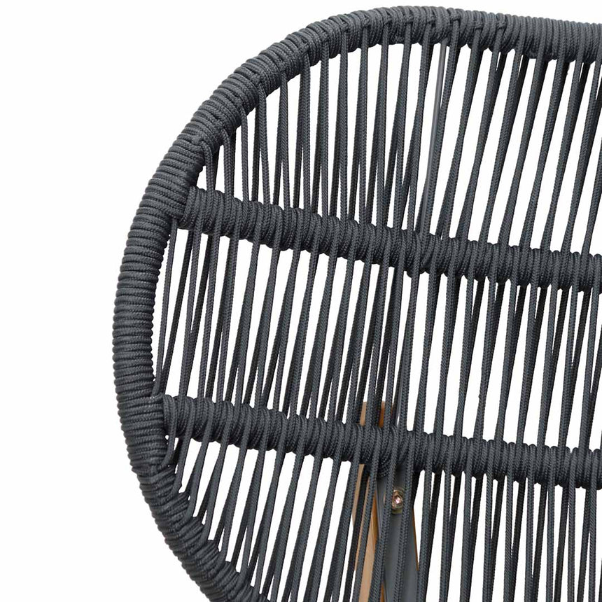 Steel frame structured in a modern style design Anthracite grey cushion 4.5mm round rope forming a curved backrest Acacia wood legs 120kg weight limit Not suggested for commercial use Product comes flatpack