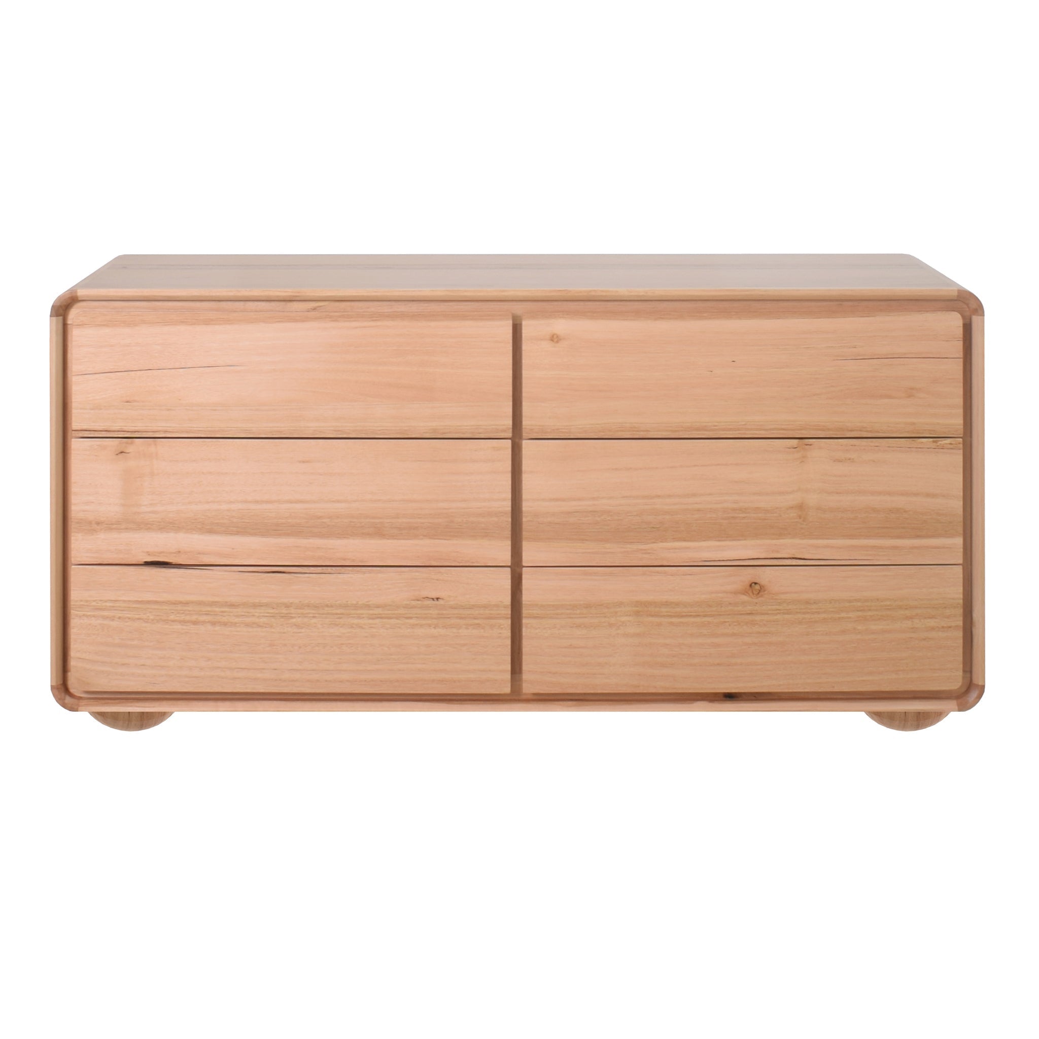 Messmate solid wood drawer fronts and legs Engineered wood top and sides with messmate veneer Messmate solid wood corners Natural wood grain patterns Soft rounded edges Seamless handle Six spacious drawers Complements a variety of interior styles Weight Capacity: Top: 30 kg, Drawers: 8 kg each Product comes fully assembled