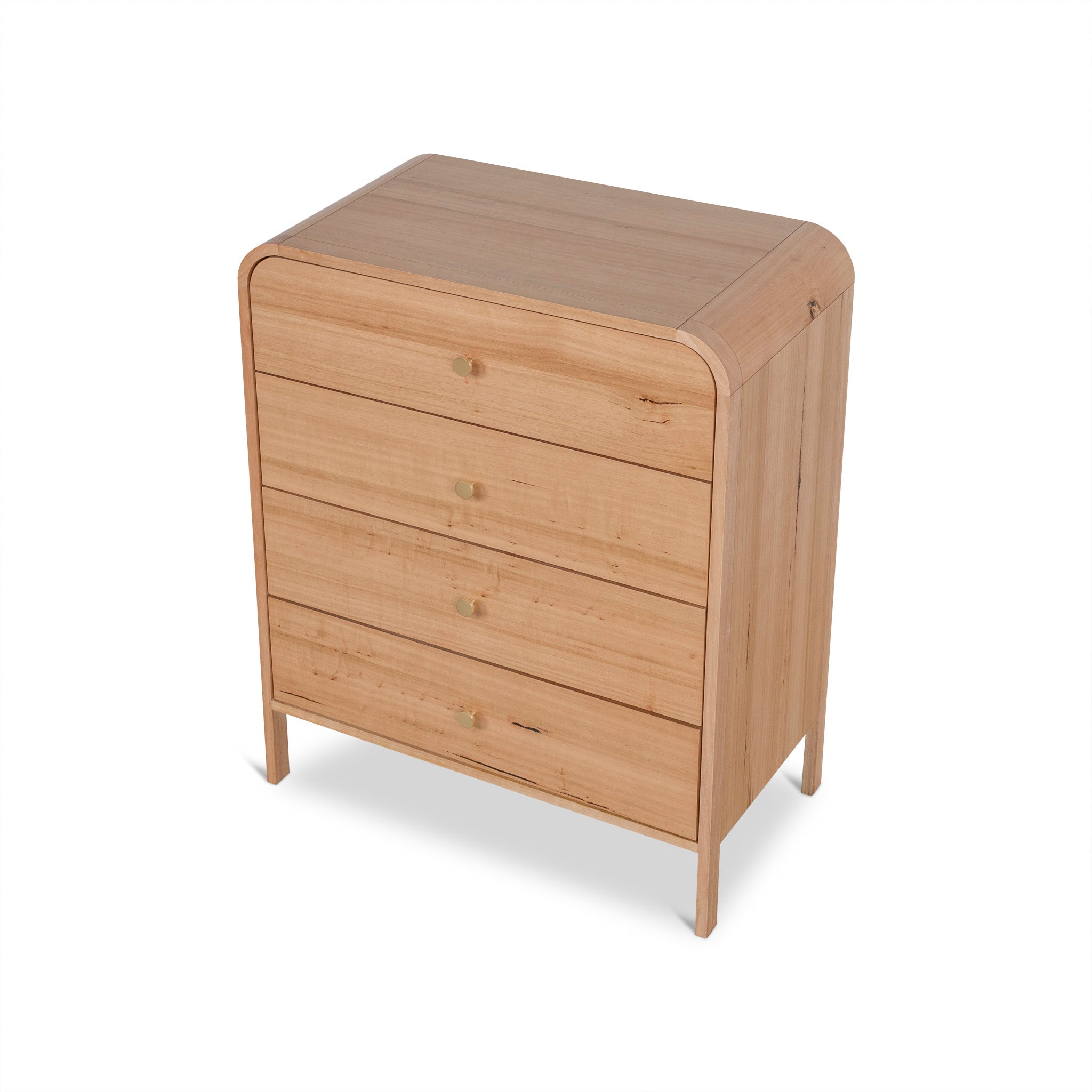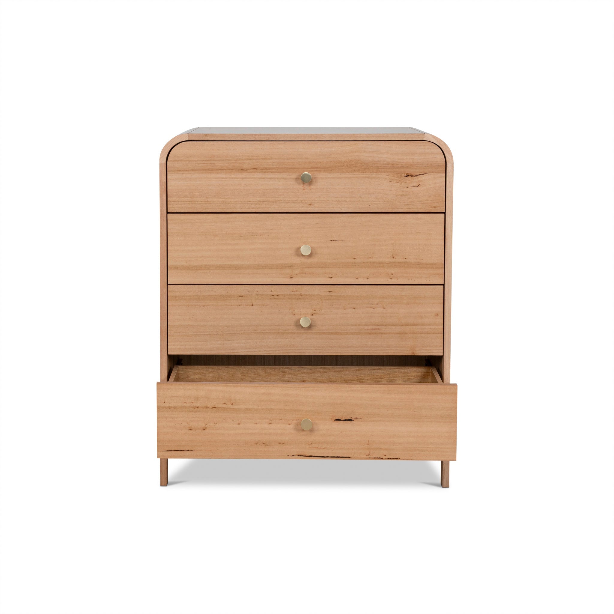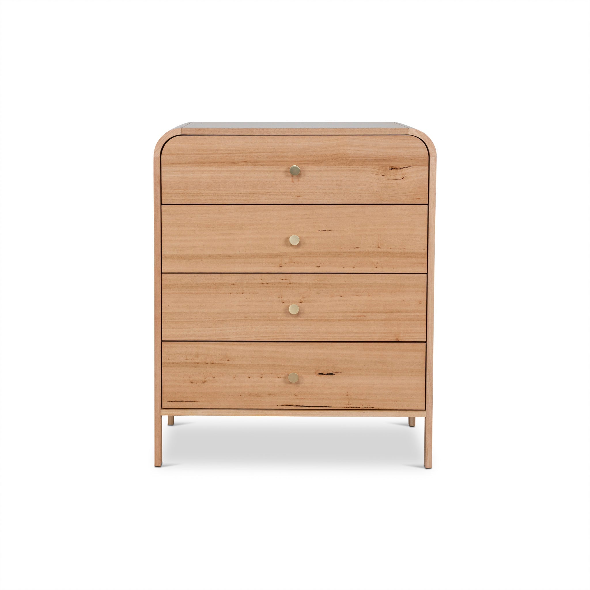 Messmate solid wood, particle board, and Messmate veneer construction Solid Messmate legs, drawer fronts, and corners Features Messmate veneer on the top and sides Softly rounded corners Four generously sized drawers Brass-toned knob handles Slim legs Natural wood tones Weight capacity: 200 kg Product comes fully assembled