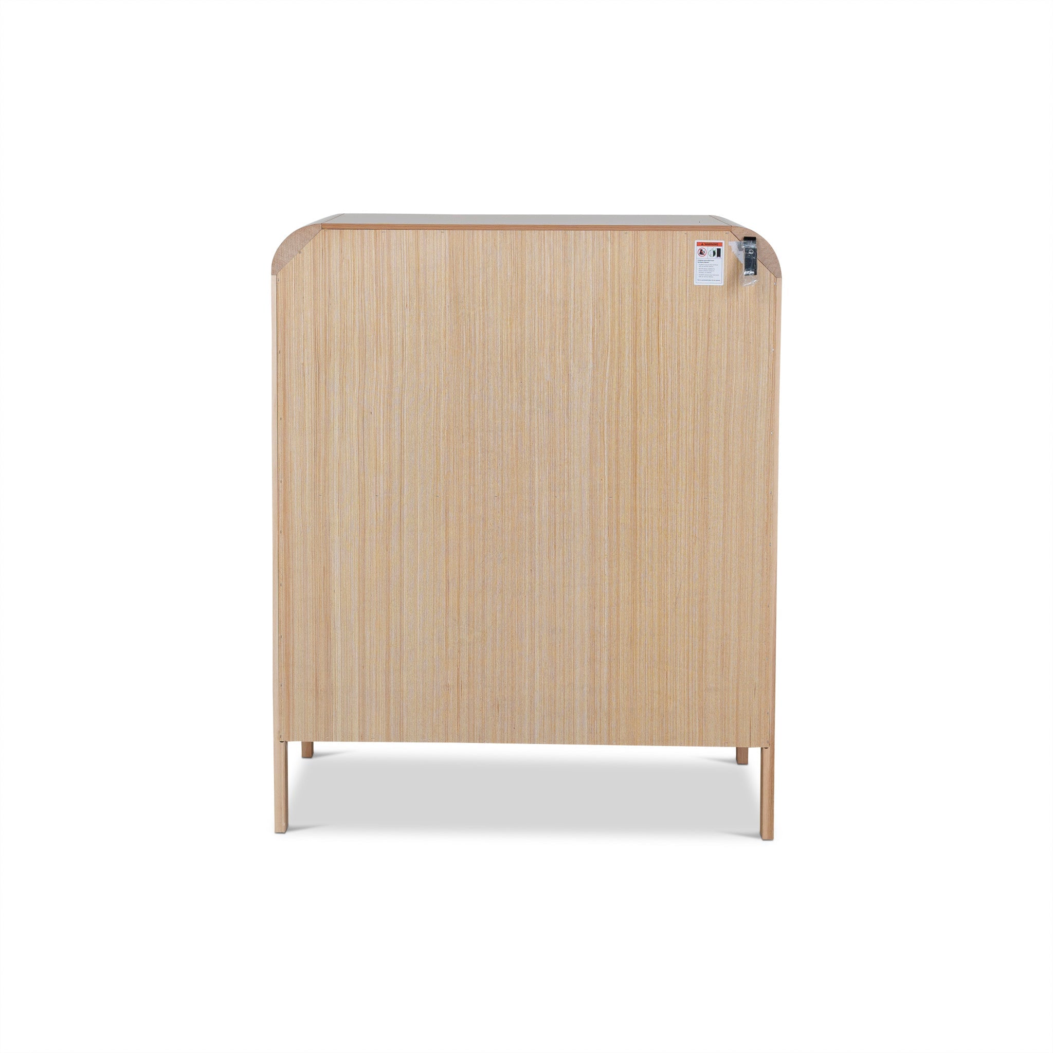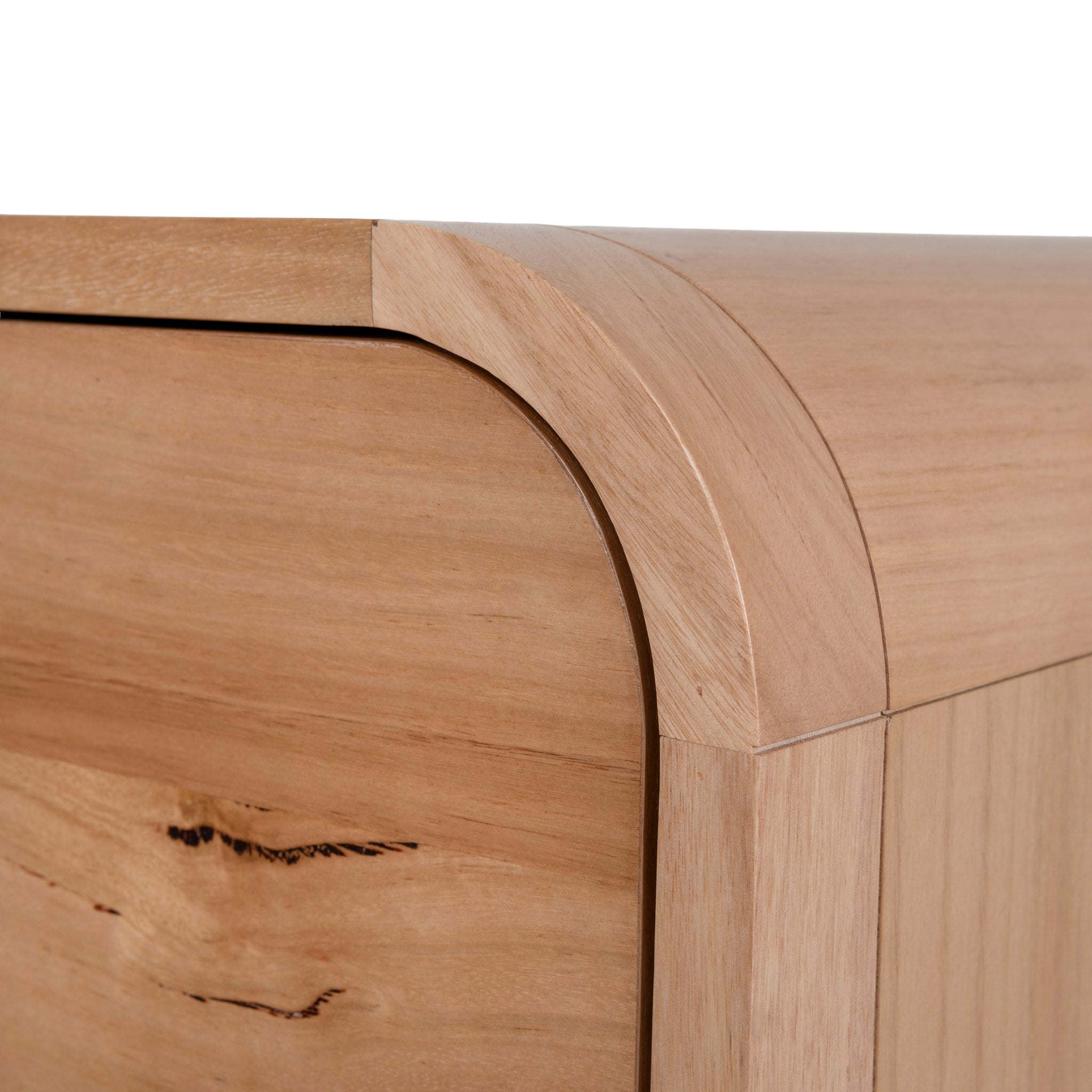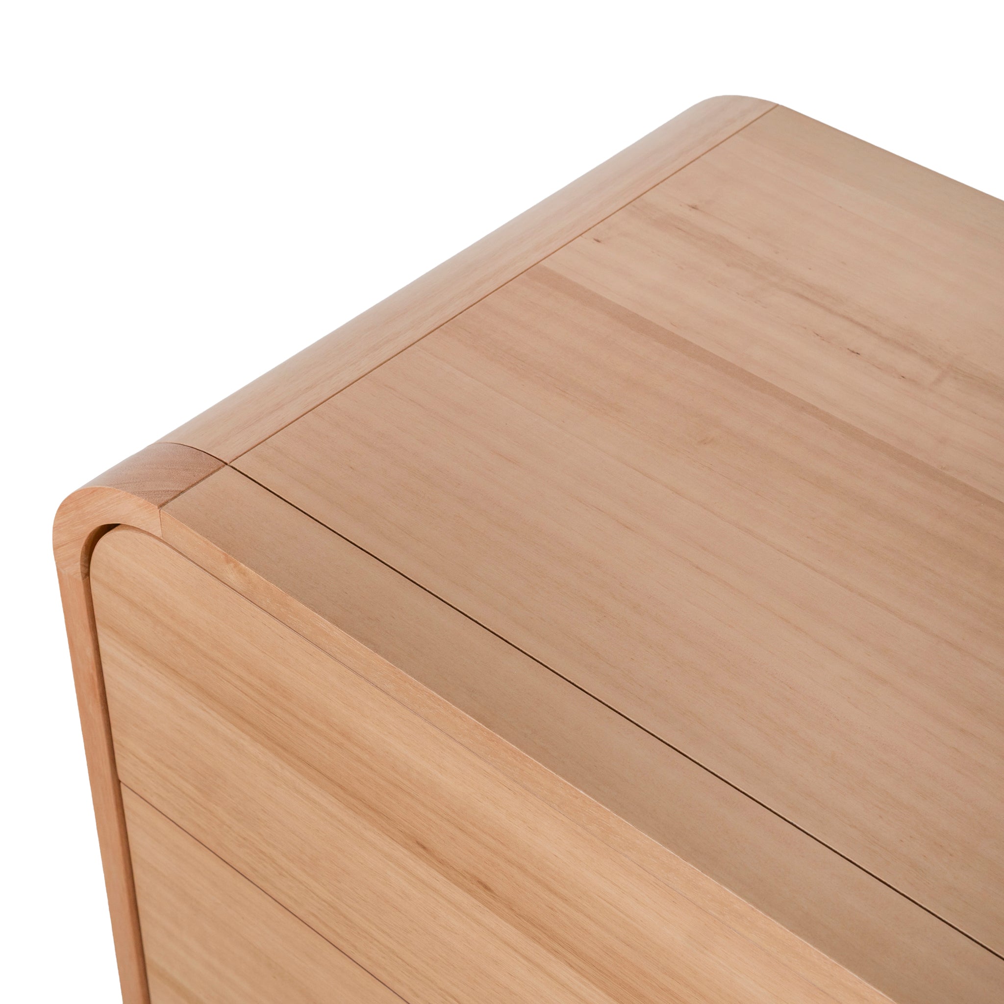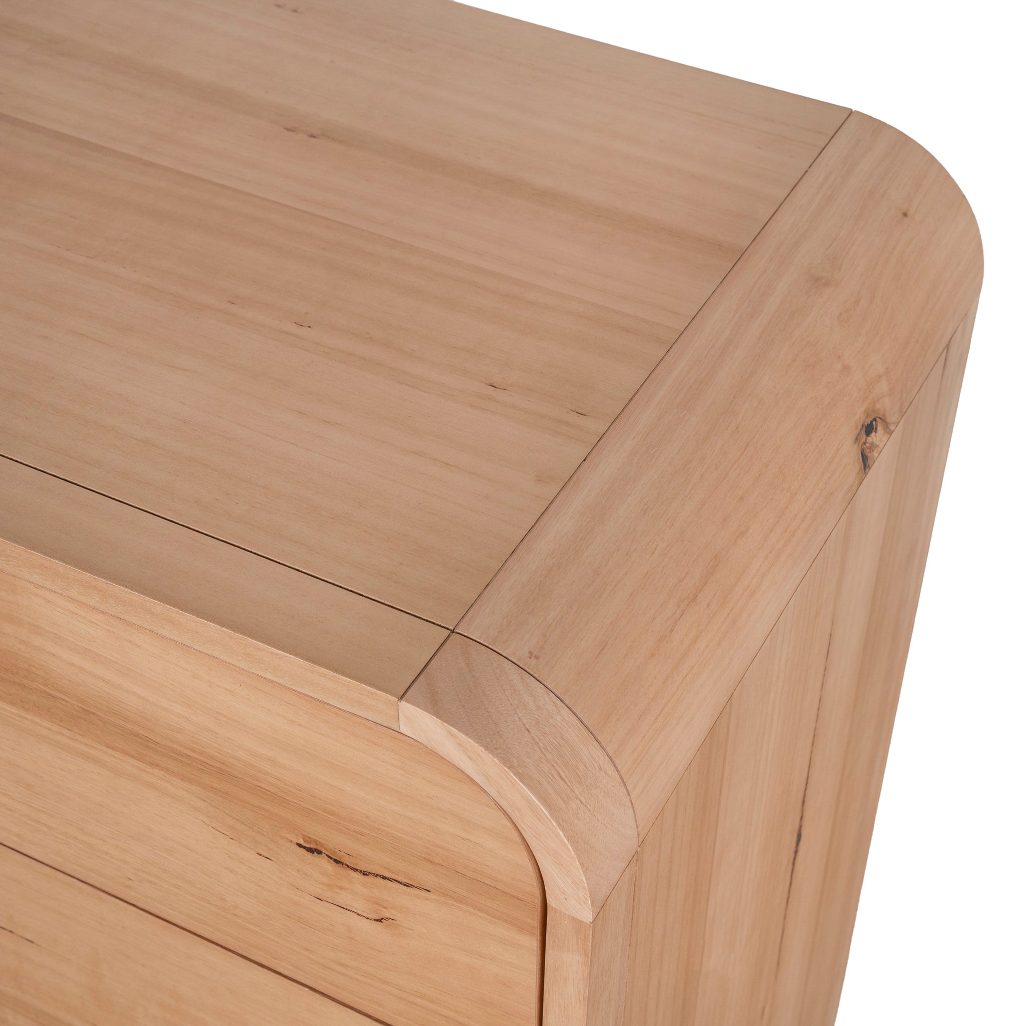 Messmate solid wood, particle board, and Messmate veneer construction Solid Messmate legs, drawer fronts, and corners Features Messmate veneer on the top and sides Softly rounded corners Four generously sized drawers Brass-toned knob handles Slim legs Natural wood tones Weight capacity: 200 kg Product comes fully assembled