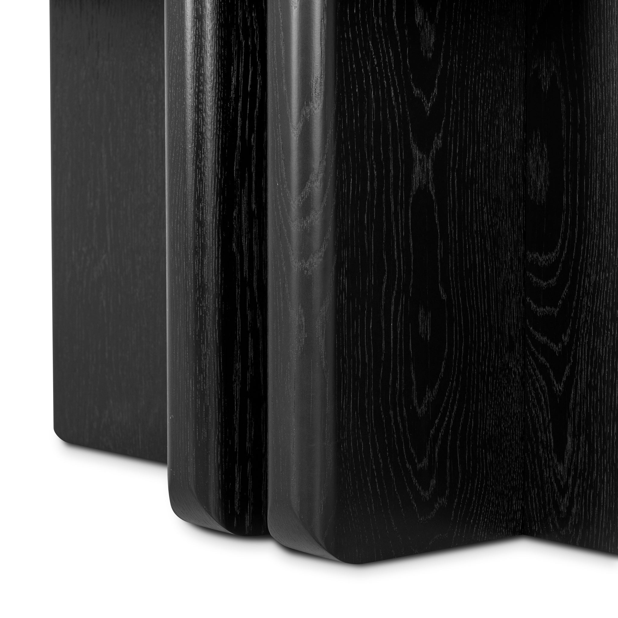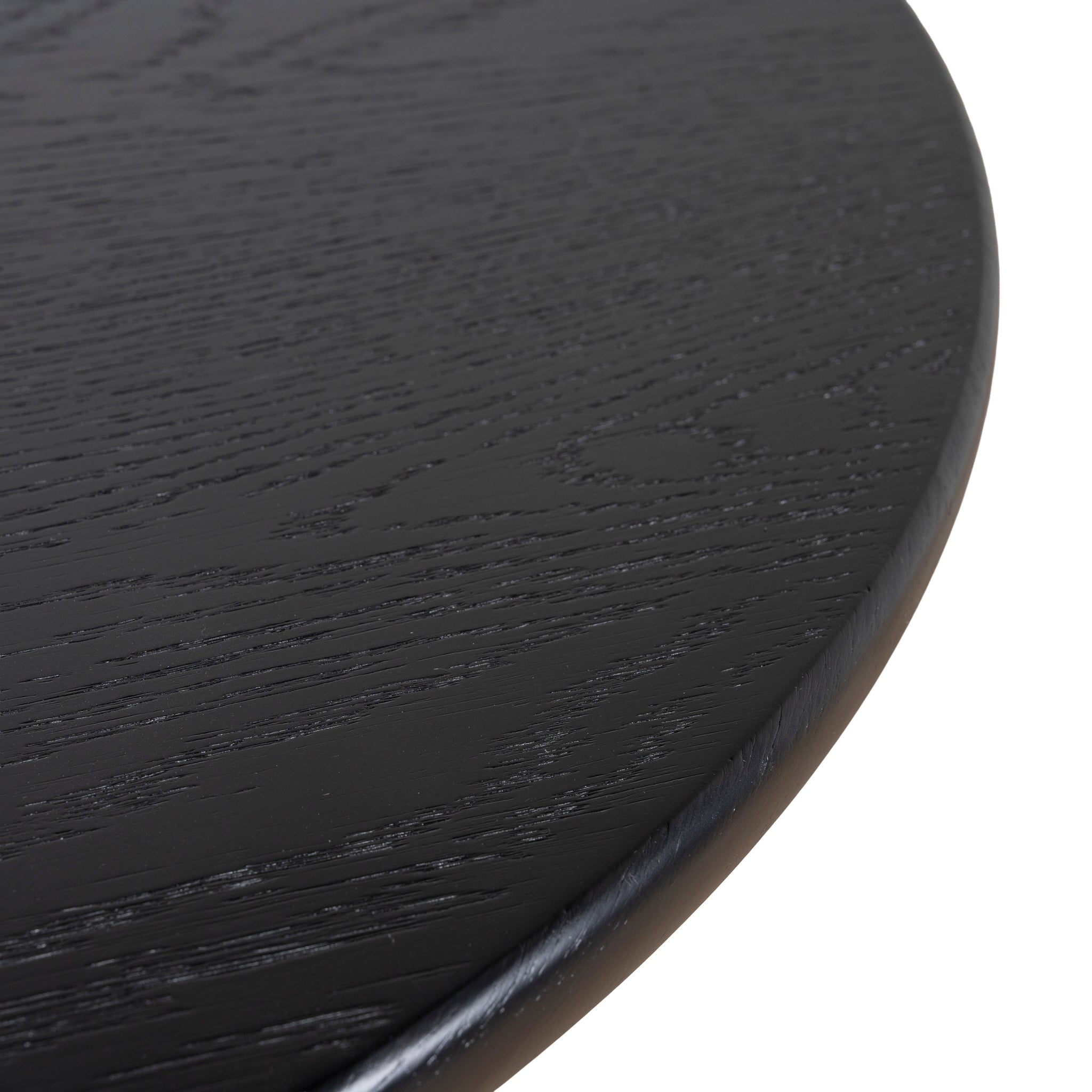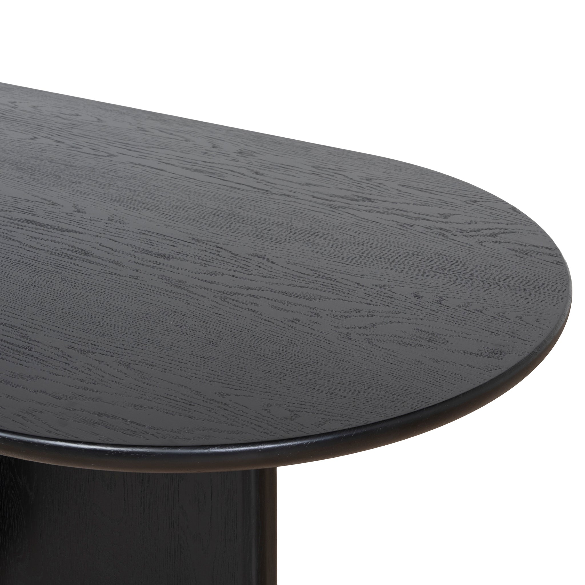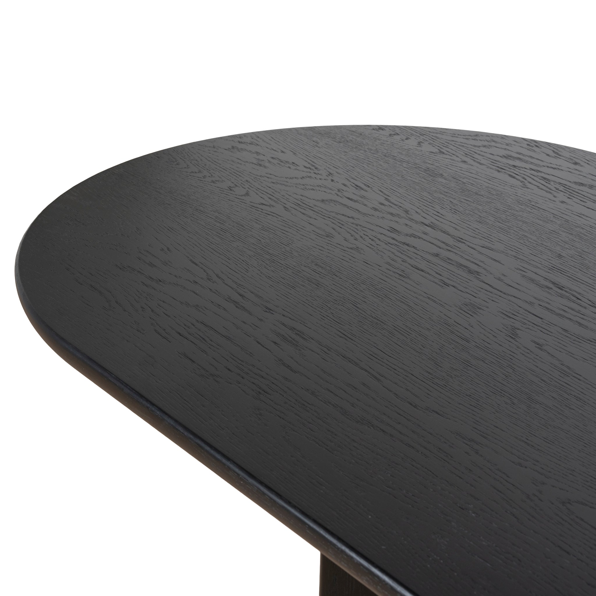 Engineered wood finished in black oak veneer Full black finish Spacious 2.4m oval tabletop Softly rounded corners Unique dual pedestal-style leg Visible wood grain texture Comfortably seats 6–8 people This product is supplied flat-packed and requires assembly by two people