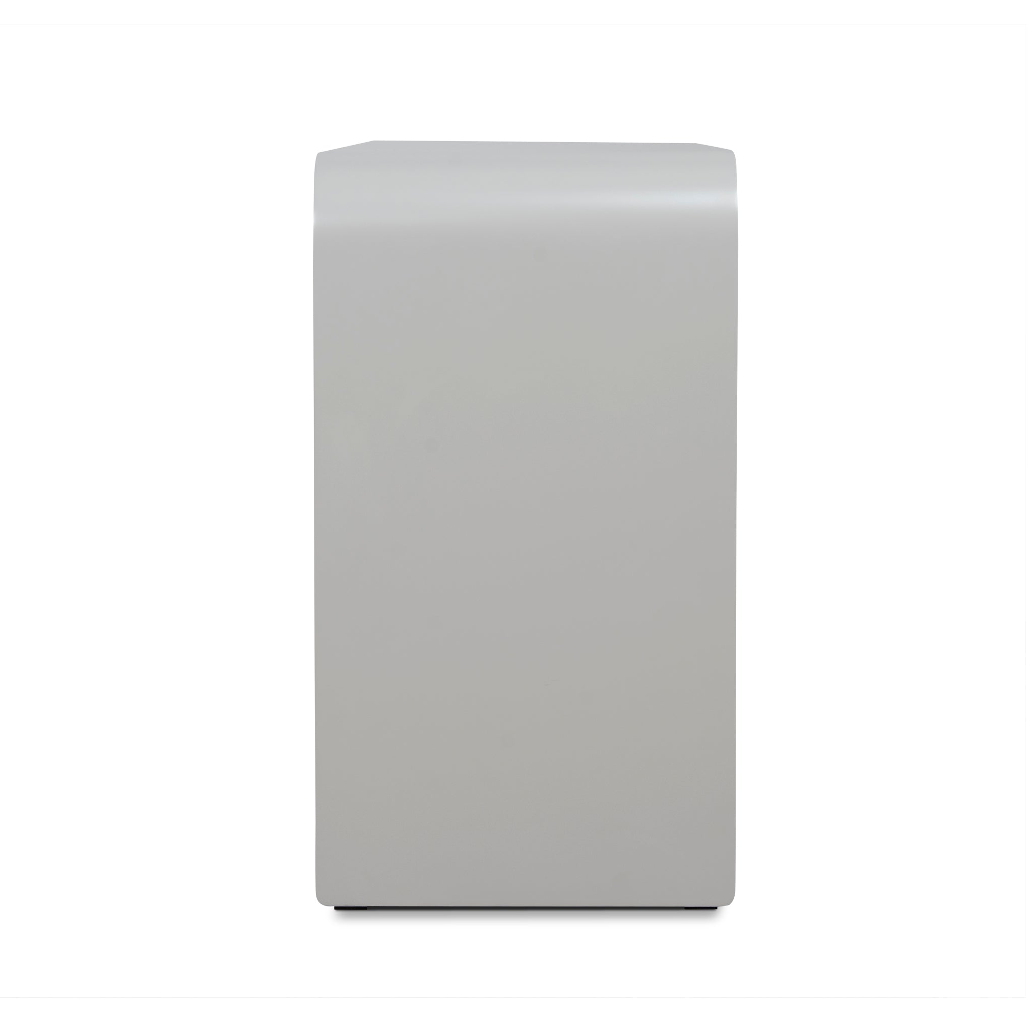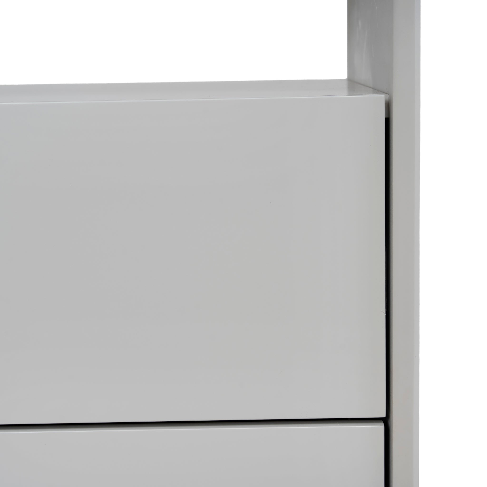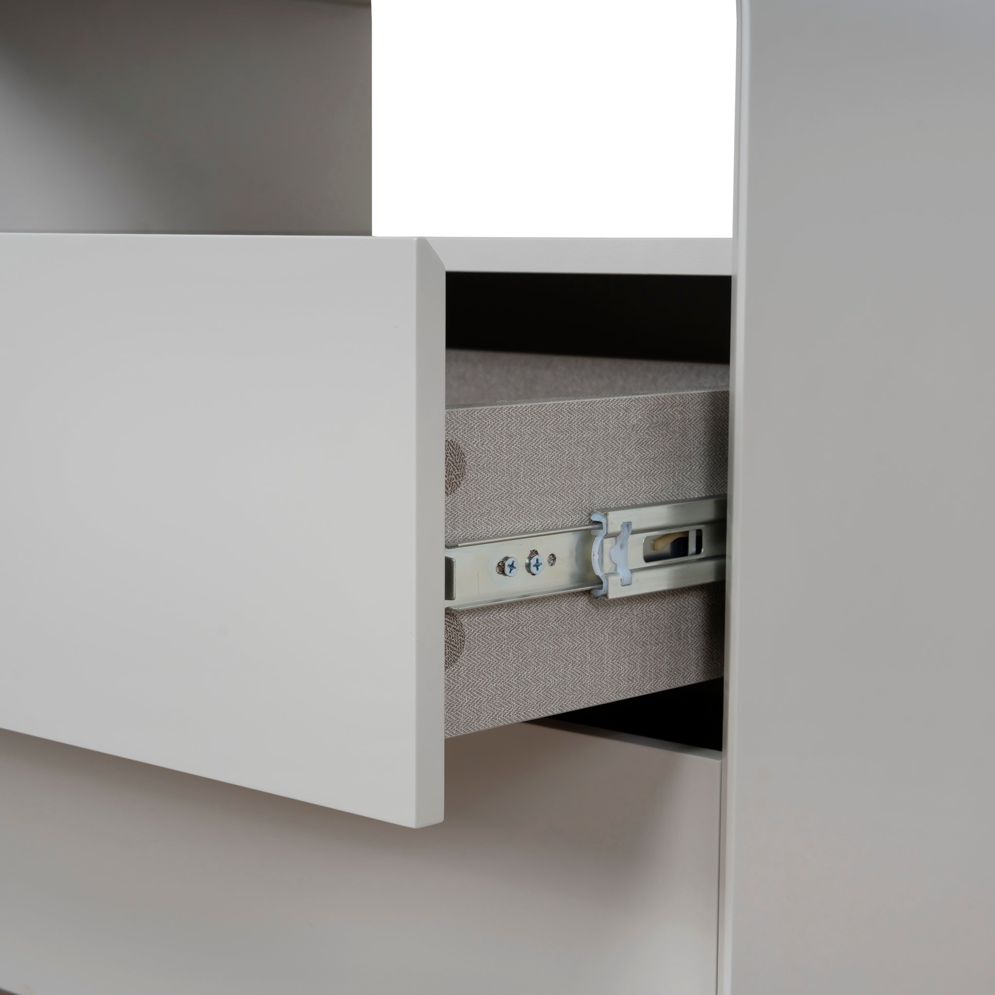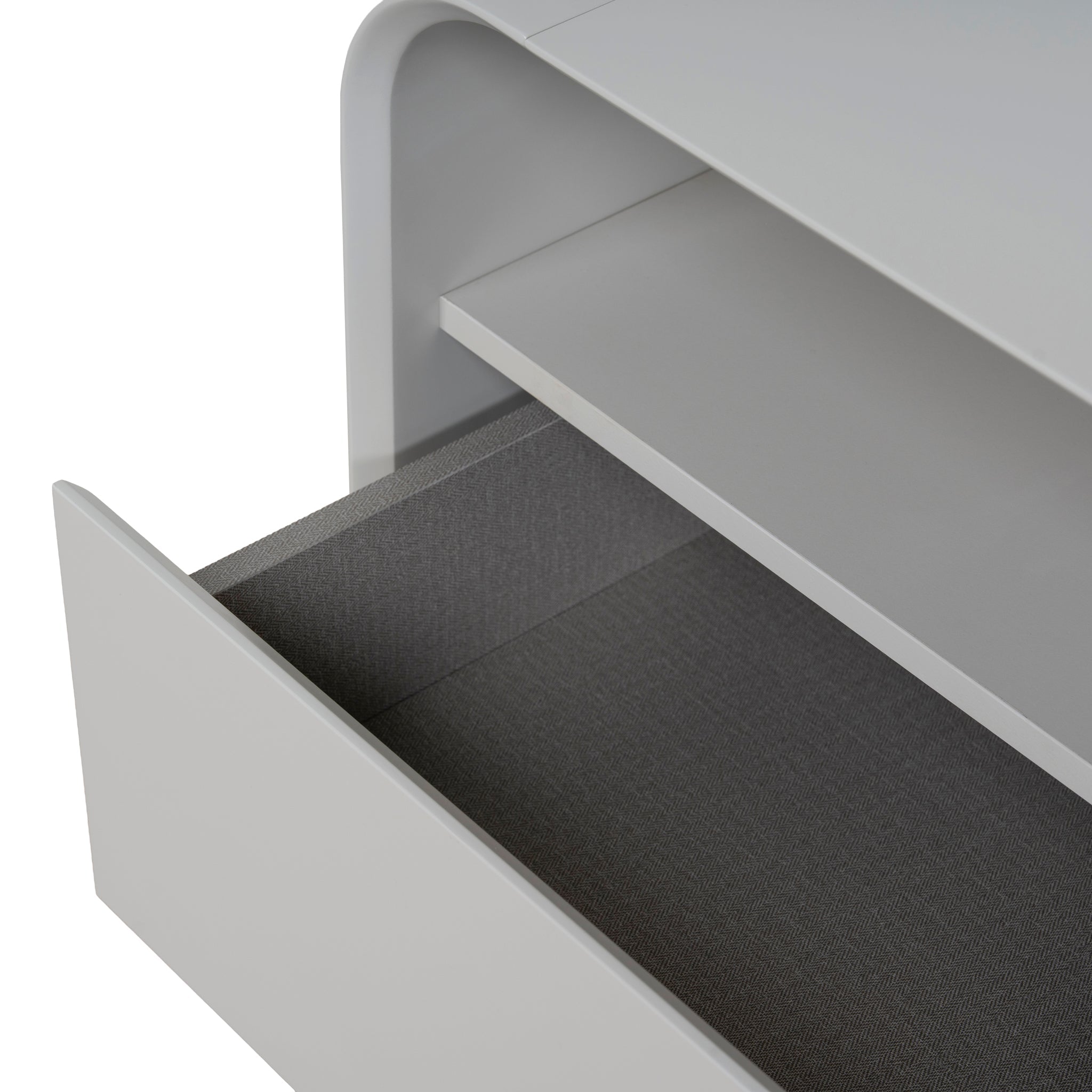 Engineered wood construction Melamine surfaces Warm grey finish Gently rounded frame Handle-free drawer fronts Four spacious drawers Open shelf design Smooth metal runners Weight capacity: 75 kg Minor assembly required