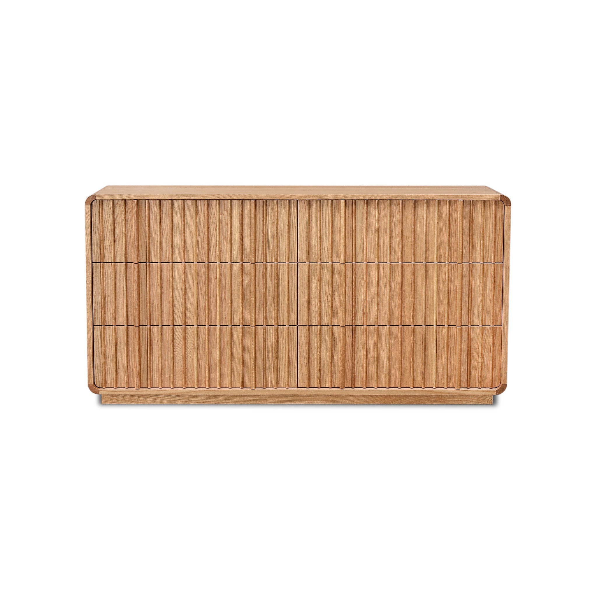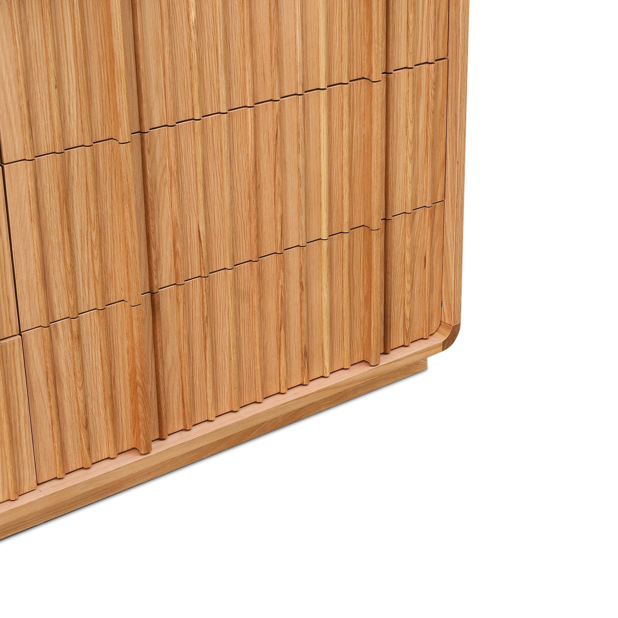 Solid white oak with white oak veneer Dimensional wave panels Curved corners Visible oak grain patterns Natural finish Six spacious drawers Low-set base with clean lines Metal runners Fully assembled product