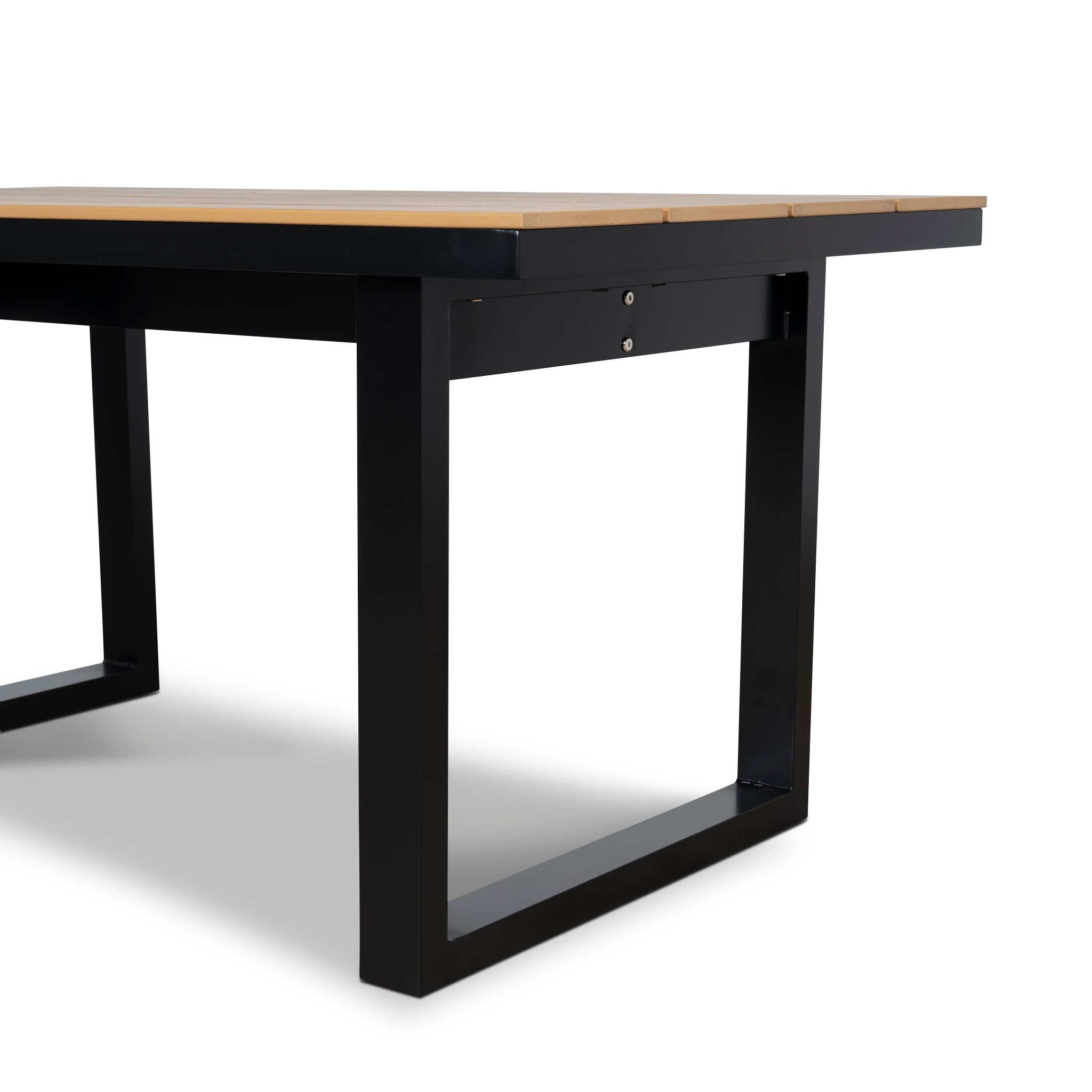 Black coated aluminum frame Aluminum leg PS board top in teak-look polywood Clean lines Rectangular legs Easy-clean surface 1.6 length seats groups comfortably This product is supplied flat-packed and requires assembly by two people