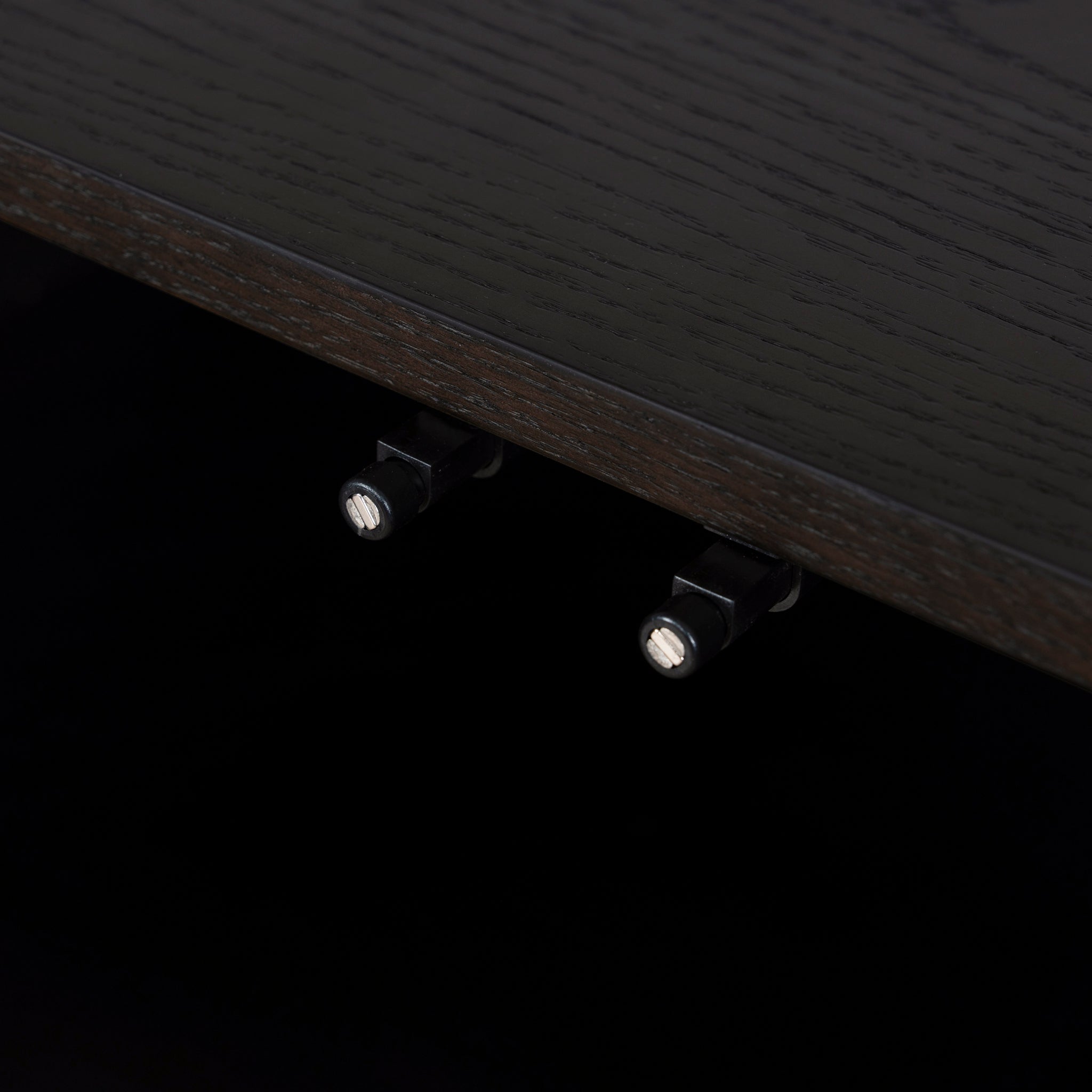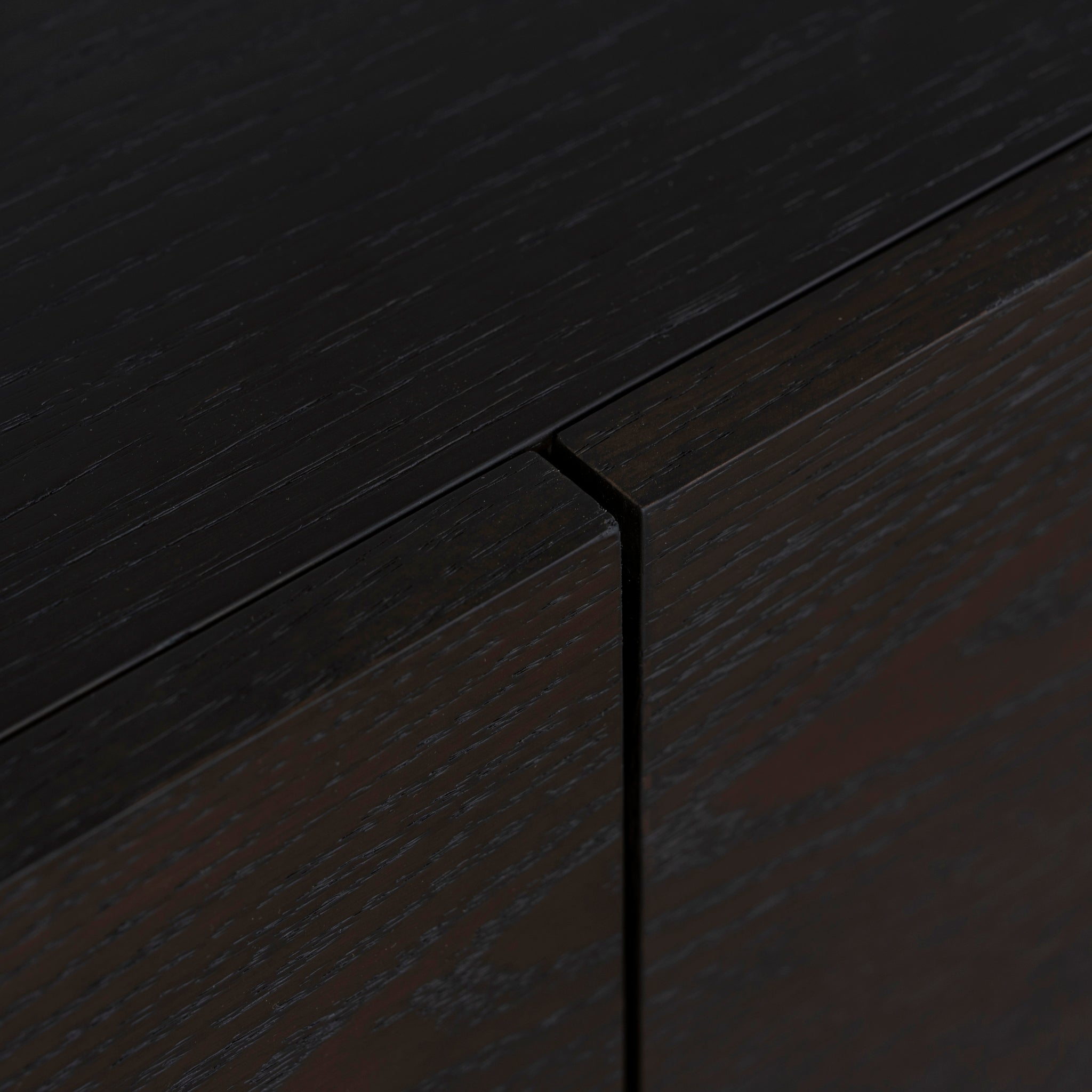 Engineered wood with dark walnut veneer Black powder-coated steel base Push-to-open, handle-free cabinet doors Internal shelves Smooth veneer with subtle wood grain Clean rectangular silhouette Weight capacity: 60 kg Minor assembly required
