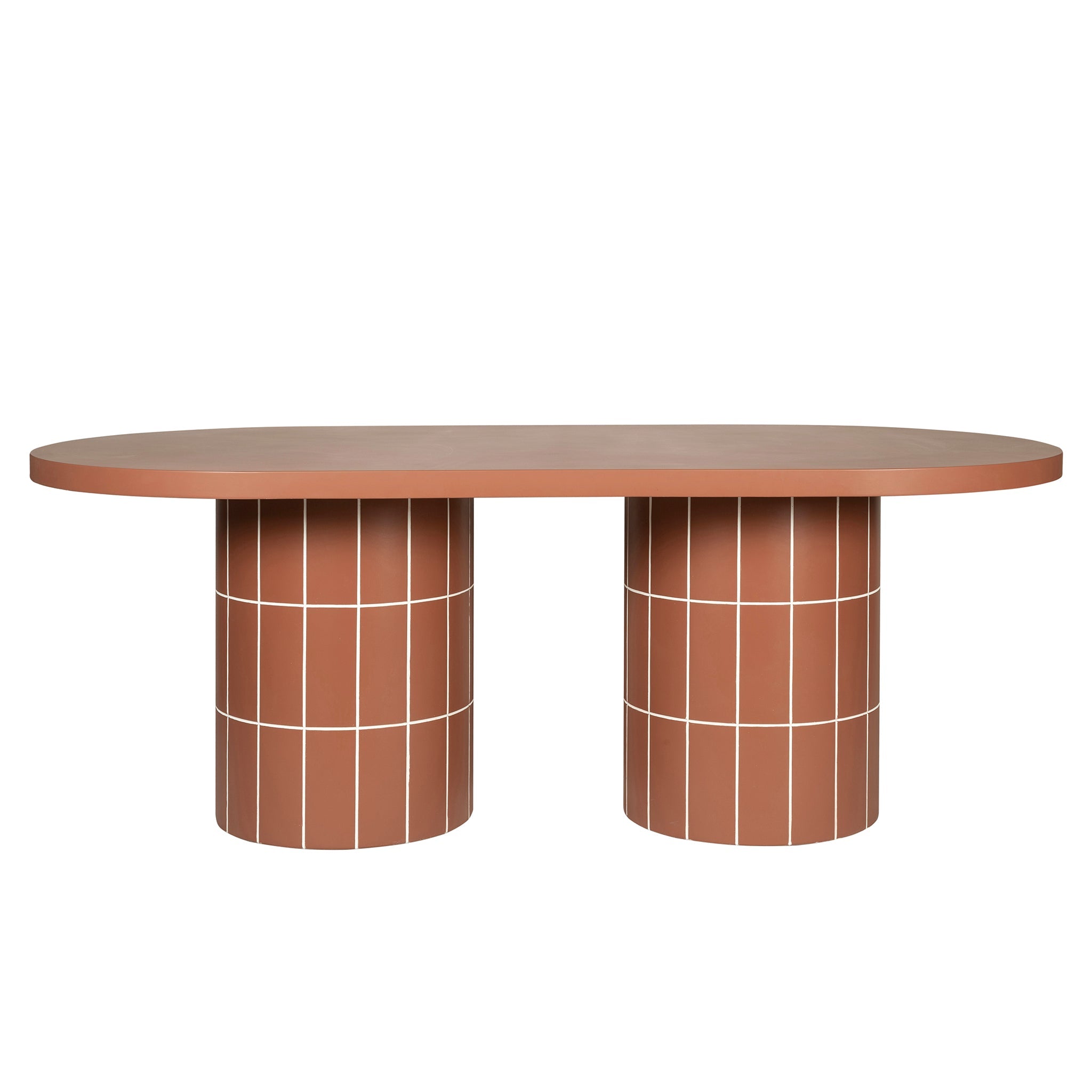 Concrete construction Terracotta finish Dual cylindrical legs with white detailing Oval top with gently curved edges Smooth surface Clean design highlighting form and texture Minor assembly required Note: Melbourne pick-up and delivery only