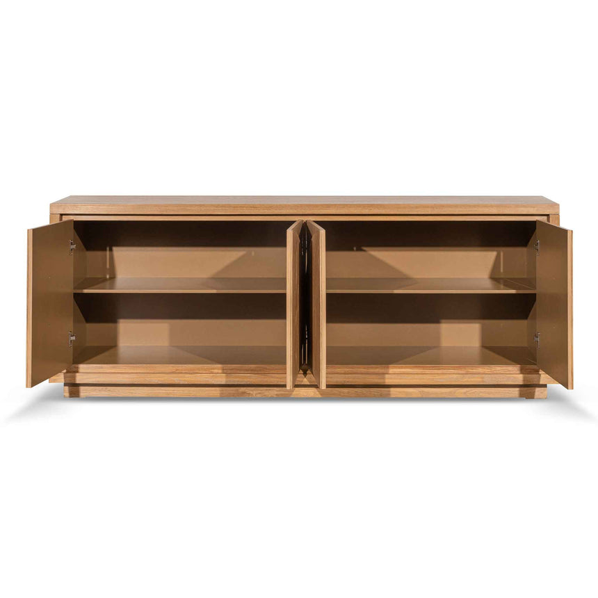 Engineered wood with natural oak veneer construction Half-moon cupboard handles demonstrating premium craftsmanship Solid and flat base for subtle height suspension and added stability Cut-out design between frame and doors Dusty oak finish with natural wood textures throughout Features 4x doors with concealed shelves Product is fully assembled Note: Due to the nature of timber and veneer, any variations of wood grain and colour are not inconsistencies and should be appreciated