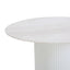 Travertine top Engineered wood base Matte white finish Cylindrical base with fluted detailing Sleek, modern, and luxurious design Ideal dining room centerpiece Minor assembly required Note: Please note that our standard warranty does not apply to natural stone products. All travertine products are carefully inspected and securely packaged in a wooden crate, which will require your own tools to open. Travertine is a natural stone, and each piece possesses its own unique imperfections and characteristics. Variations in color, texture, polish, and pattern are inherent to the material and should be appreciated as part of its natural beauty. This product is porous, and contact with liquids or hot beverages may cause marking on the surface. We strongly recommend wiping away any spills immediately with water or a mild cleaner. To further protect the integrity of the surface, the use of placemats and coasters is advised.