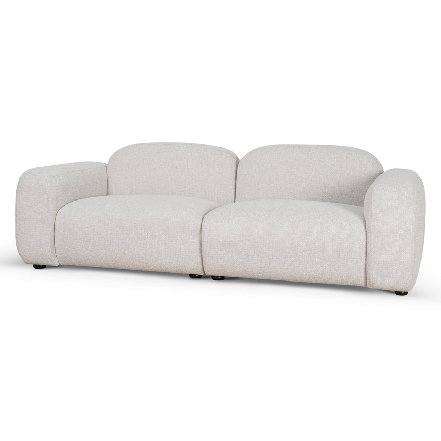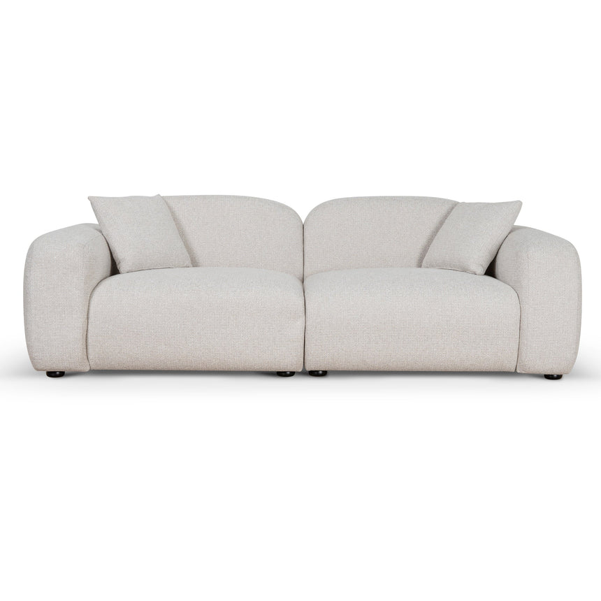 Stone Beige polyester upholstery Wood frame with plywood construction Spring suspension Soft seat with foam filling Rubberwood timber legs Rounded design with curved armrests Distributed weight capacity of up to: 250 kg Assembly Information: Please note that the feet of the sofa should be positioned in the desired location, ensuring the screws are secured within the corner wooden frame. There are no pre-marked spots for the feet, allowing flexibility in alignment and visibility of the feet for aesthetic preferences. An electric drill is required to secure the screws into the feet for proper assembly. The sofa does not require the connectors for regular use, but they are supplied as an optional feature. If you wish to lock the two sofa sections in place, position the sections together and drill in the connectors along the edge of the base frame, following the indicated line.