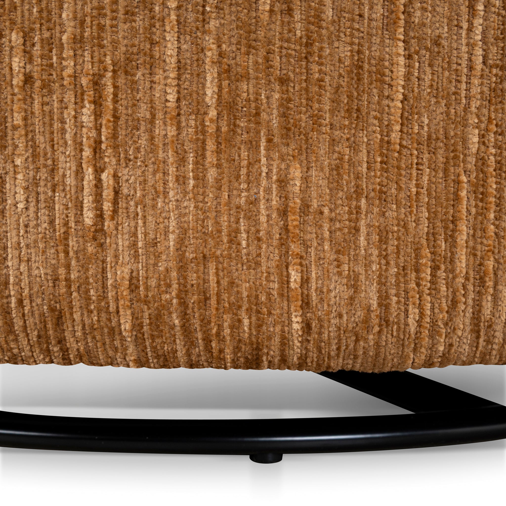 Honey gold polyester upholstery Pinewood and plywood frame Web suspension Fiber and feather filling Gently sloped backrest and curved sides Plinth base with swivel functionality Rubber legs Soft-medium seat firmness Weight Capacity: 120 kg Minor assembly required