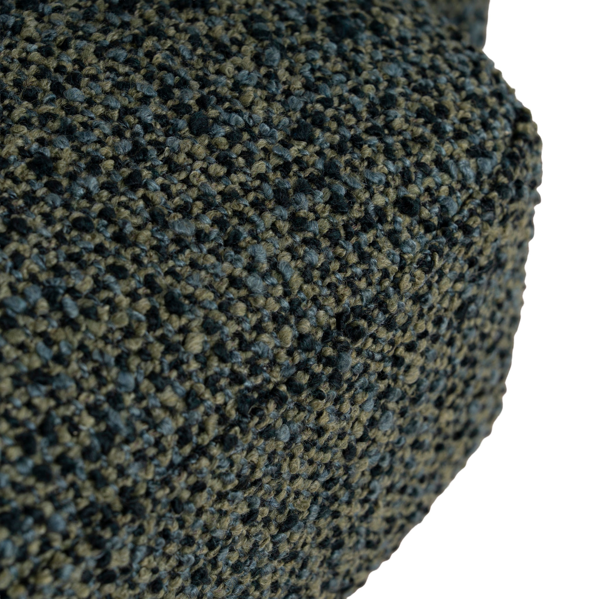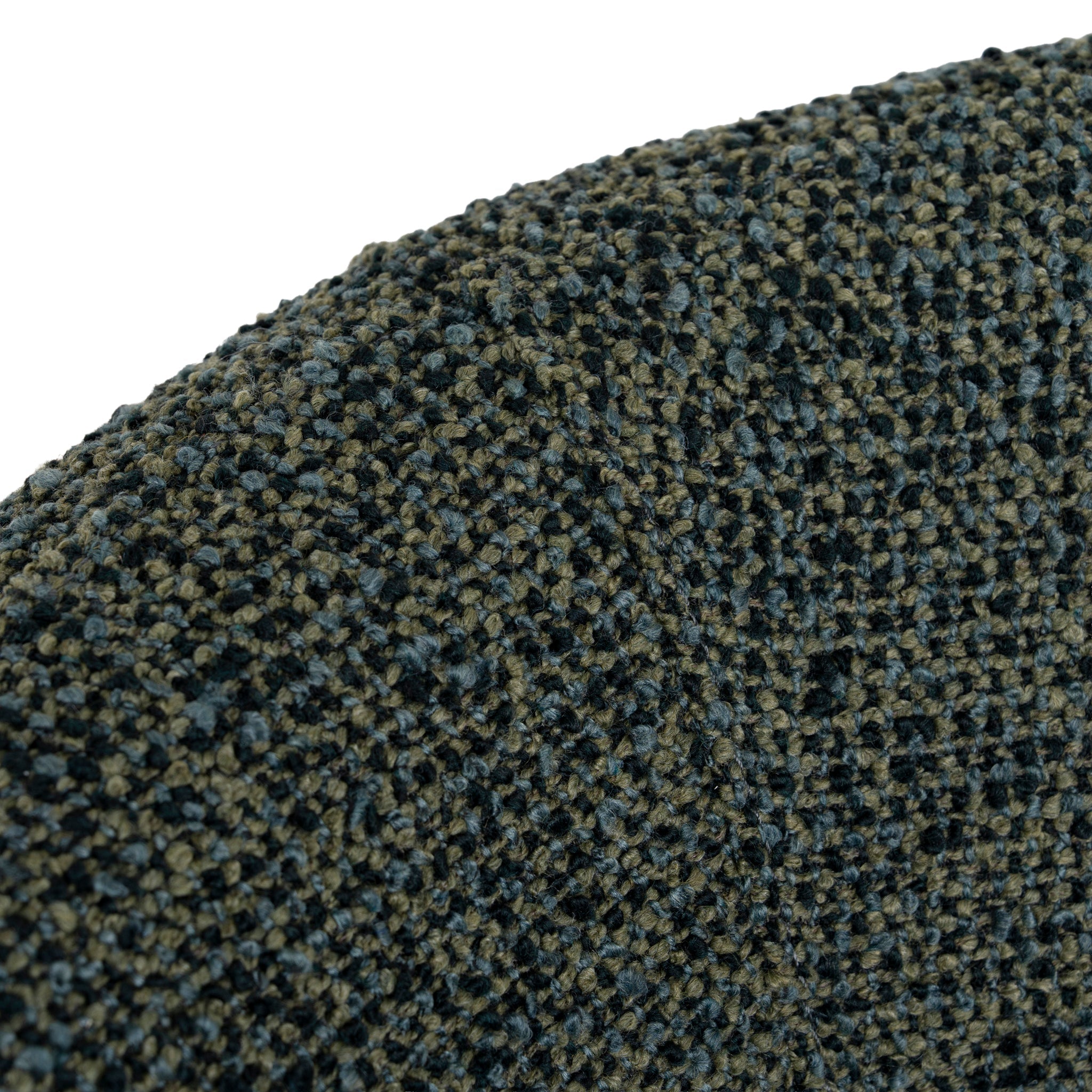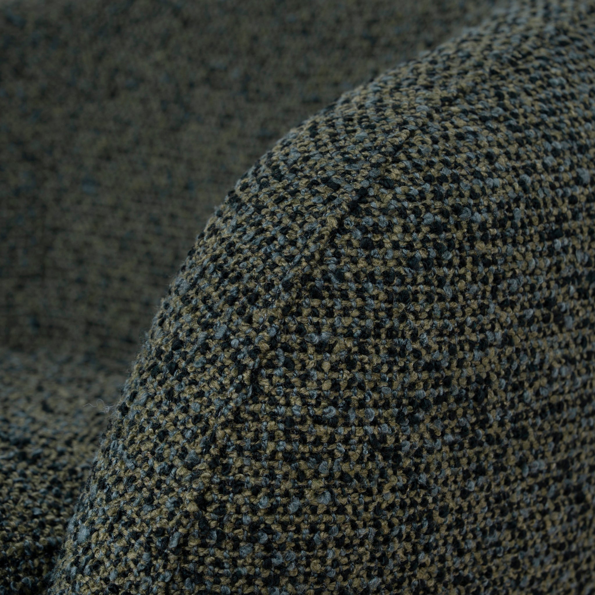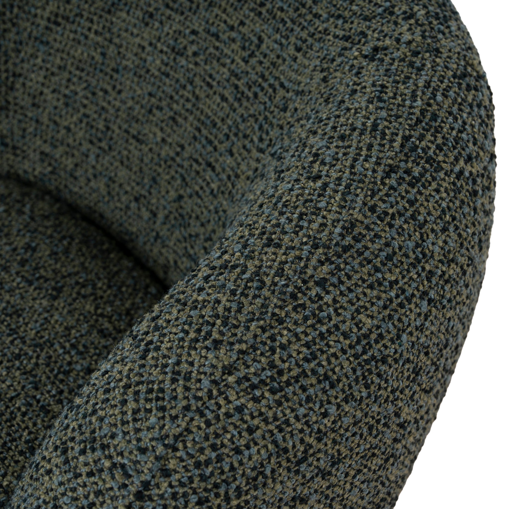 Dusky green polyester upholstery Pine wood frame Foam filling Veneer base in a warm wood tone Soft-medium seat firmness Stable swivel base for easy rotation Web and spring suspension Compact rounded silhouette with cocoon-like backrest Weight capacity: 200 kg Product comes fully assembled