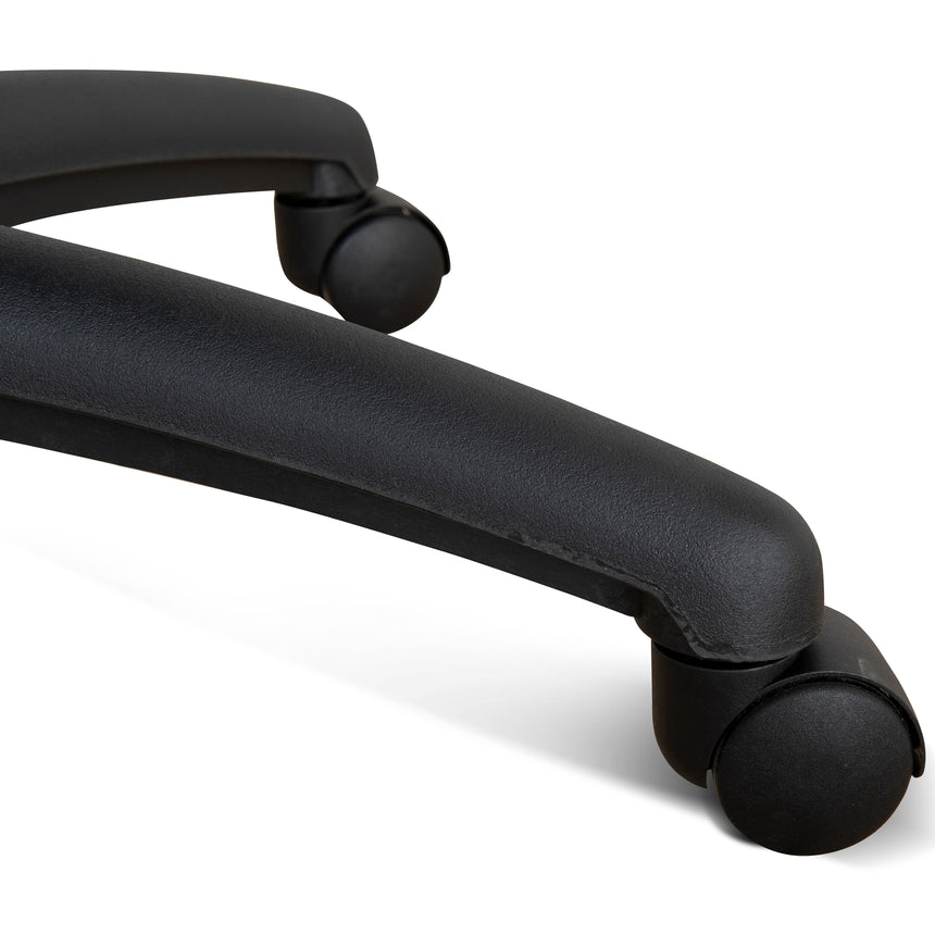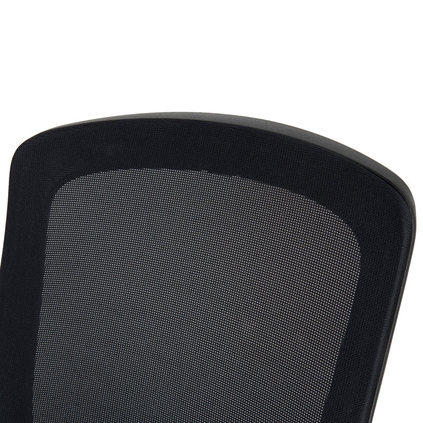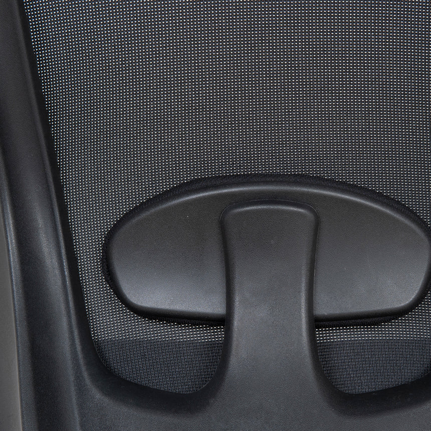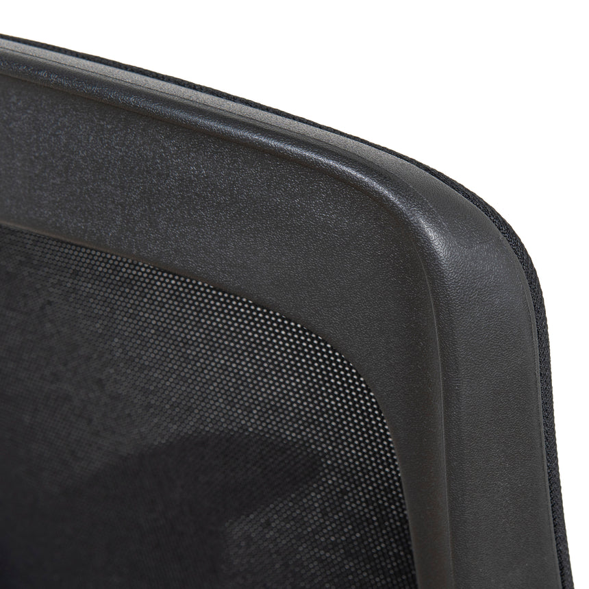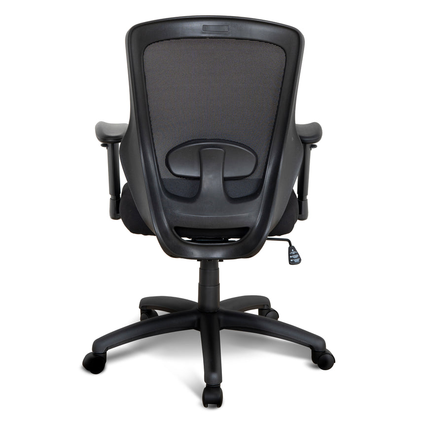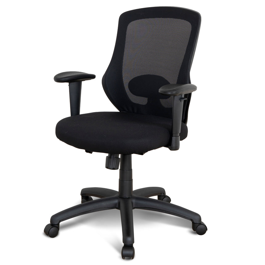 Breathable mesh back in full black finish Contoured plywood seat rest with durable fabric upholstery Heavy duty nylon castor wheels in powder black base Ratchet back feature with ergonomic lumbar support Tilting mechanism with one point lock Tension and arm adjustment included 360 degree swivel with adjustable gas-lift seat height Product is flat packed and requires two-man assembly