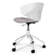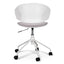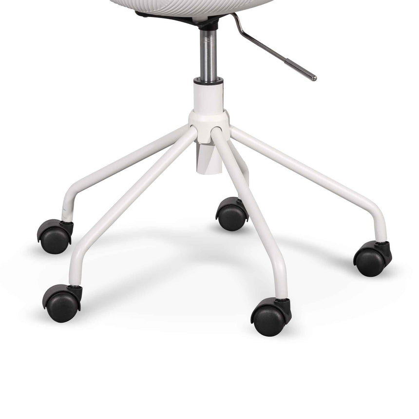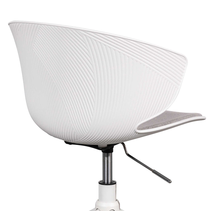 Moulded and contoured polypropylene frame and detailing Fabric upholstered seat with soft foam moulding Herringbone patterned back with lumbar support Metal base in a powder white finish Heavy-duty castors wheels in matte black 360-degree swivel and adjustable gas-lift seat height Weight capacity of 100kg 3-year warranty Product is flat packed and requires two-man assembly.