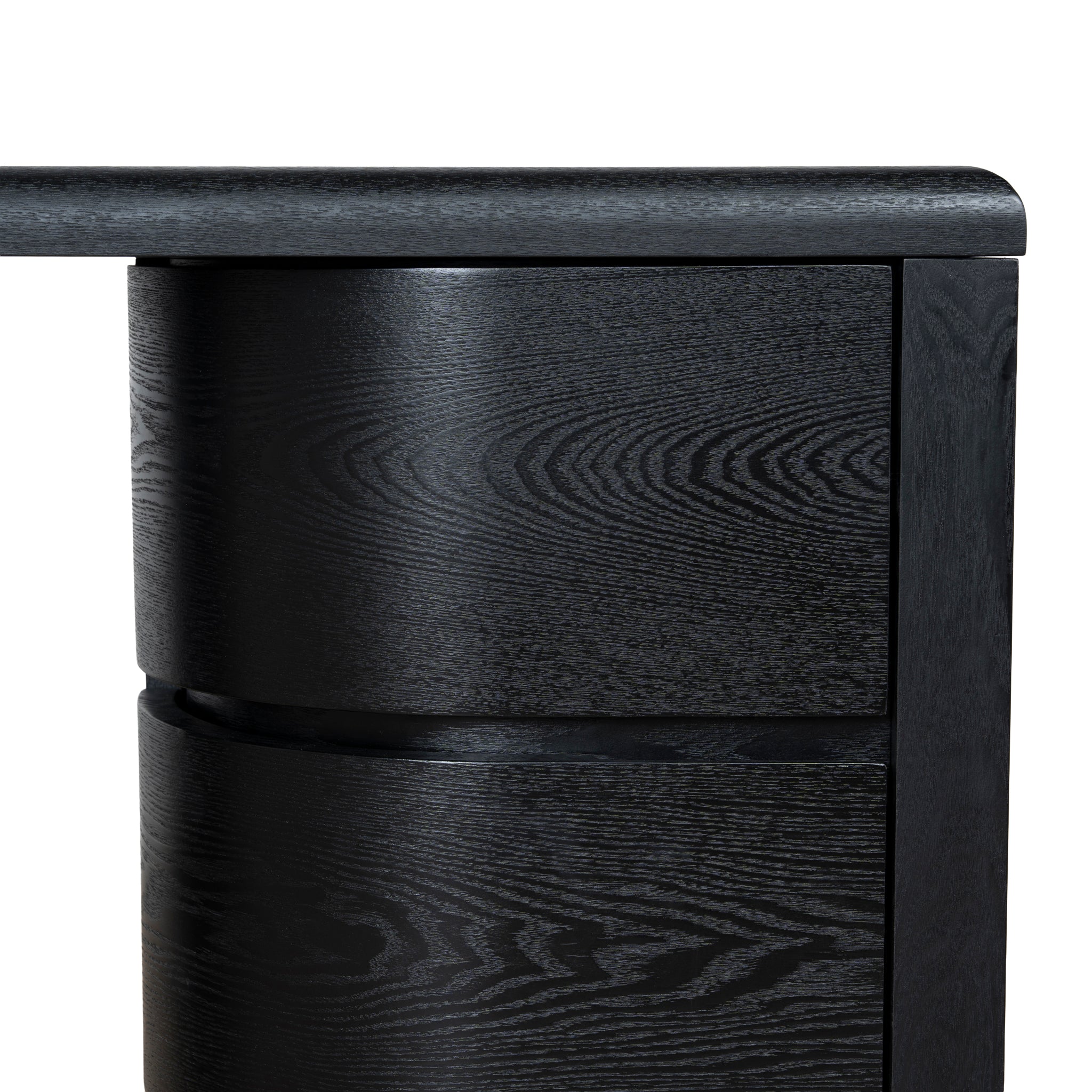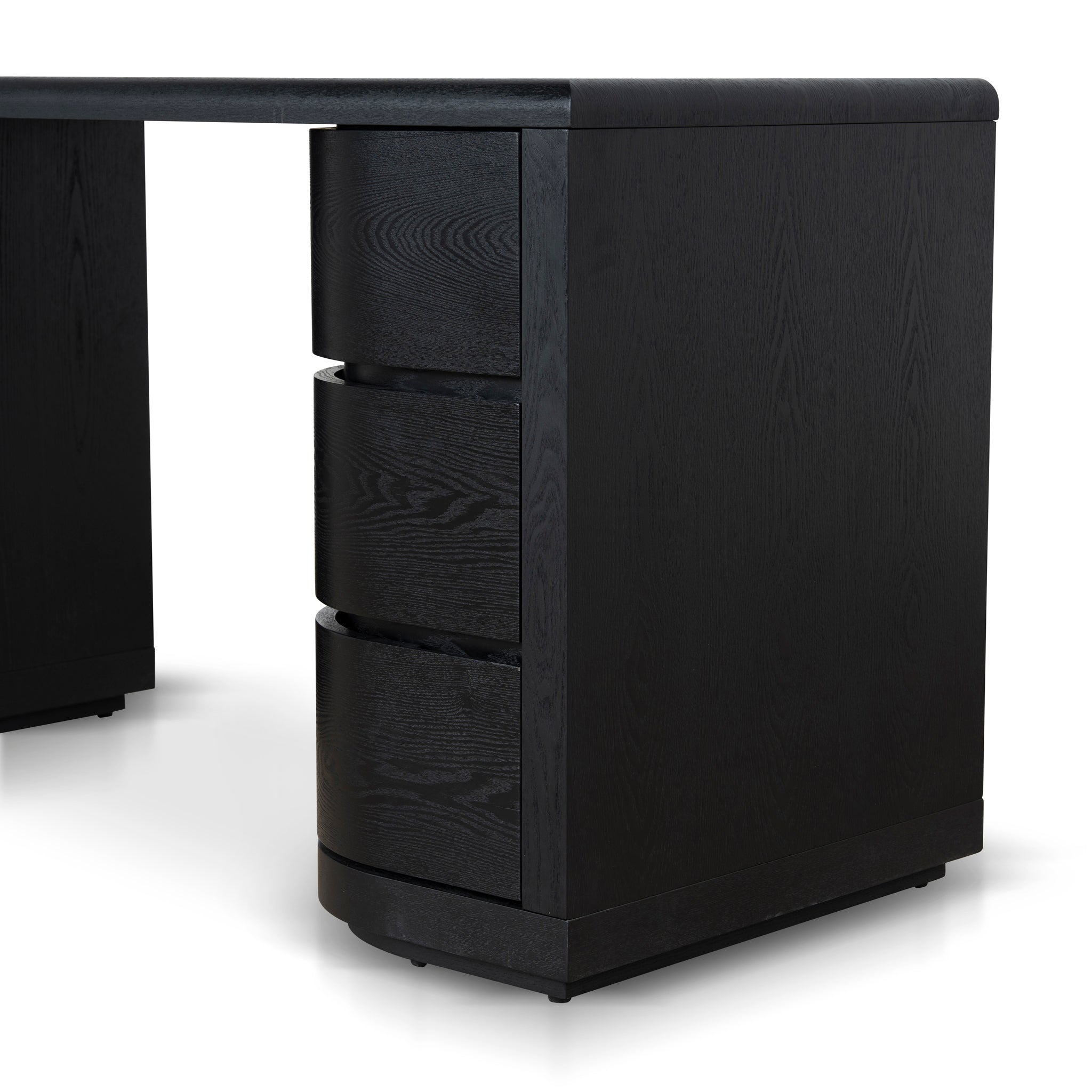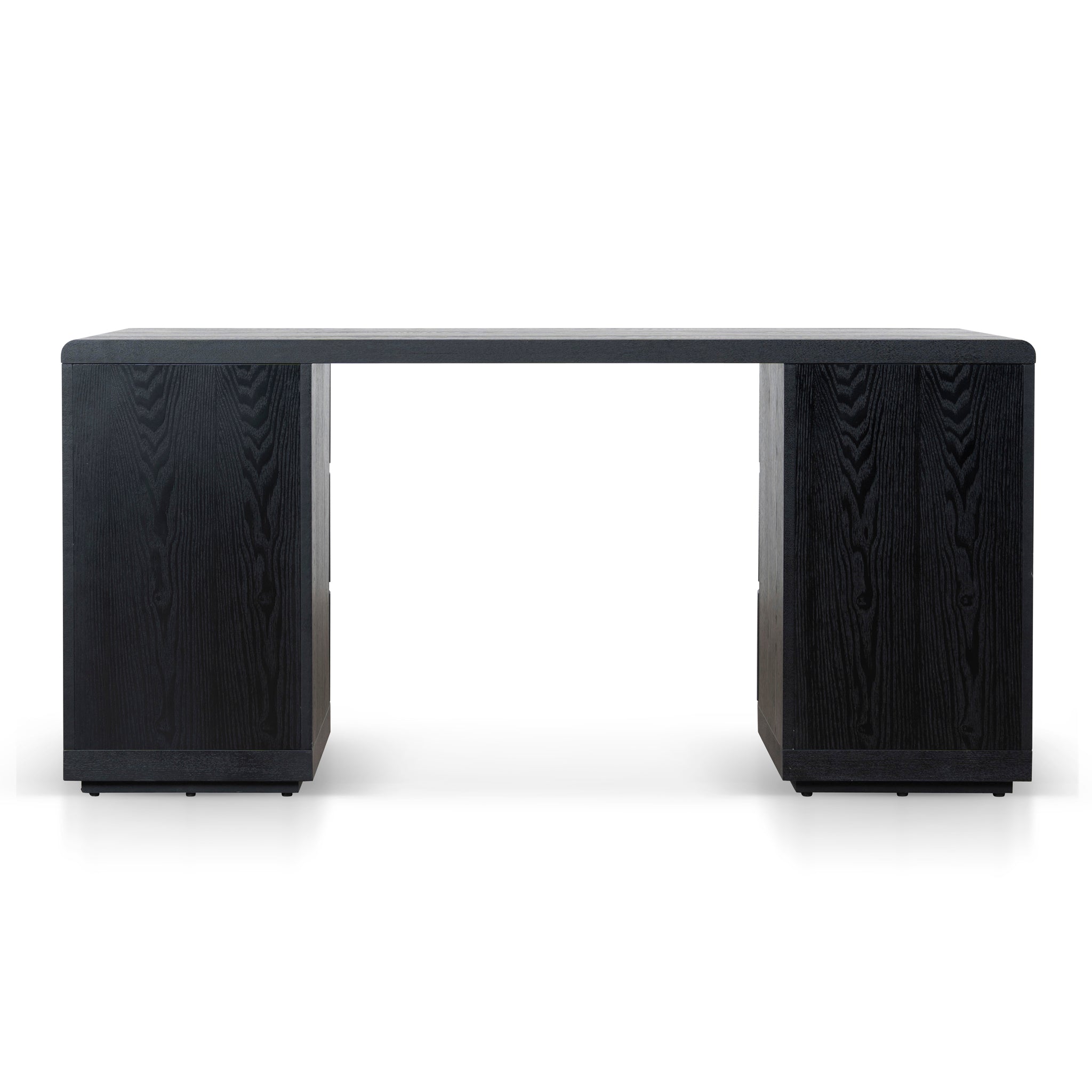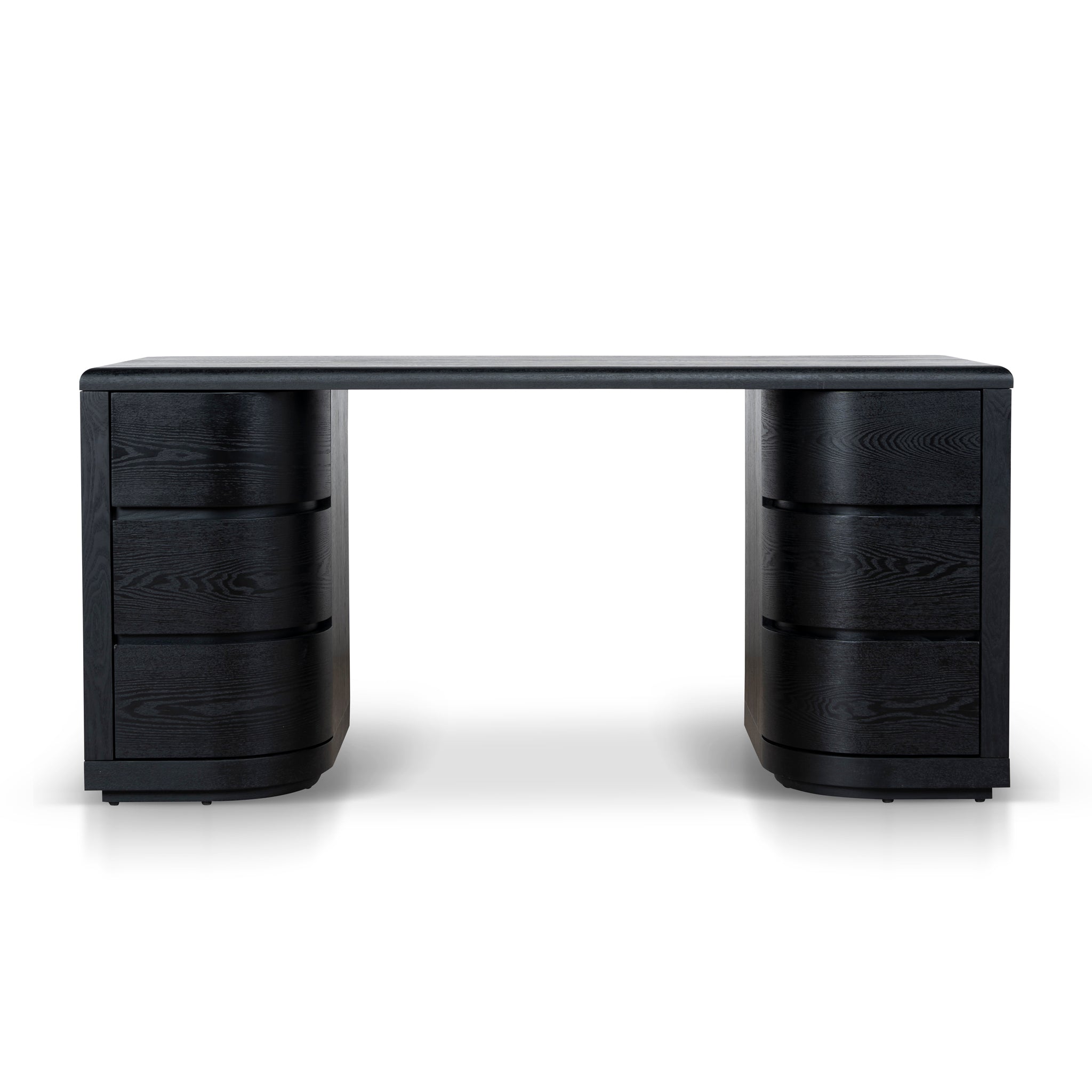 Engineered wood with walnut veneer Triamine board interior drawers Dual pedestal form Smooth, rounded shape Rounded desktop edges Full black finish Six smooth-glide drawers Weight capacity: 100 kg Minor assembly required