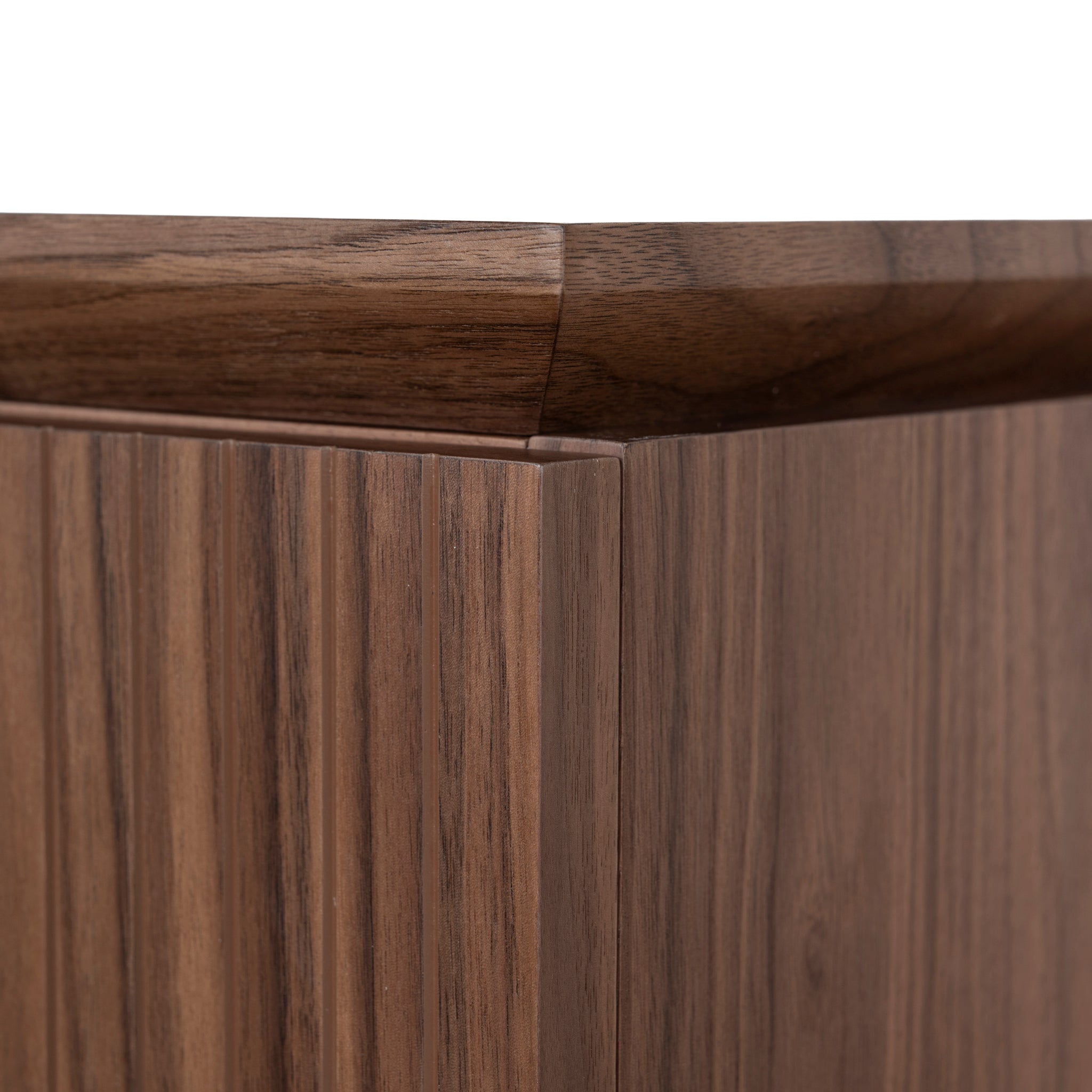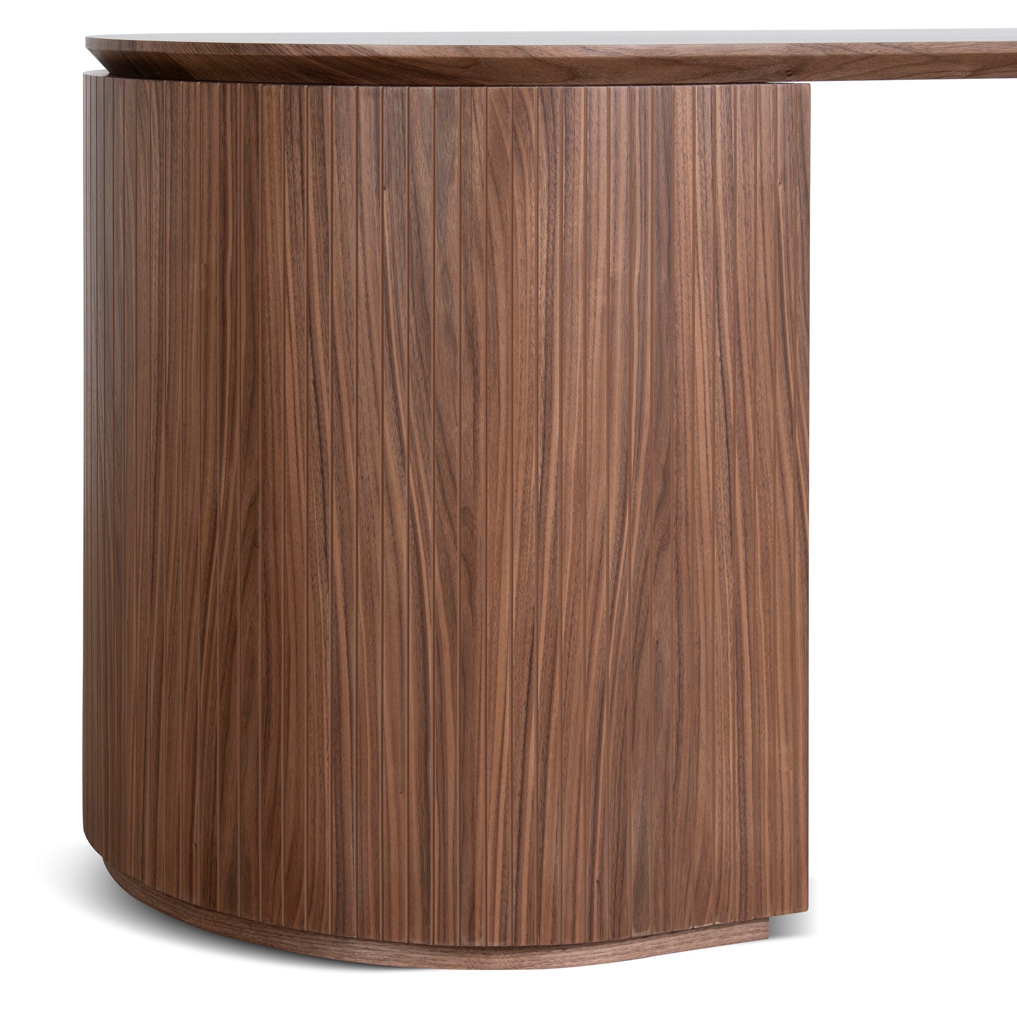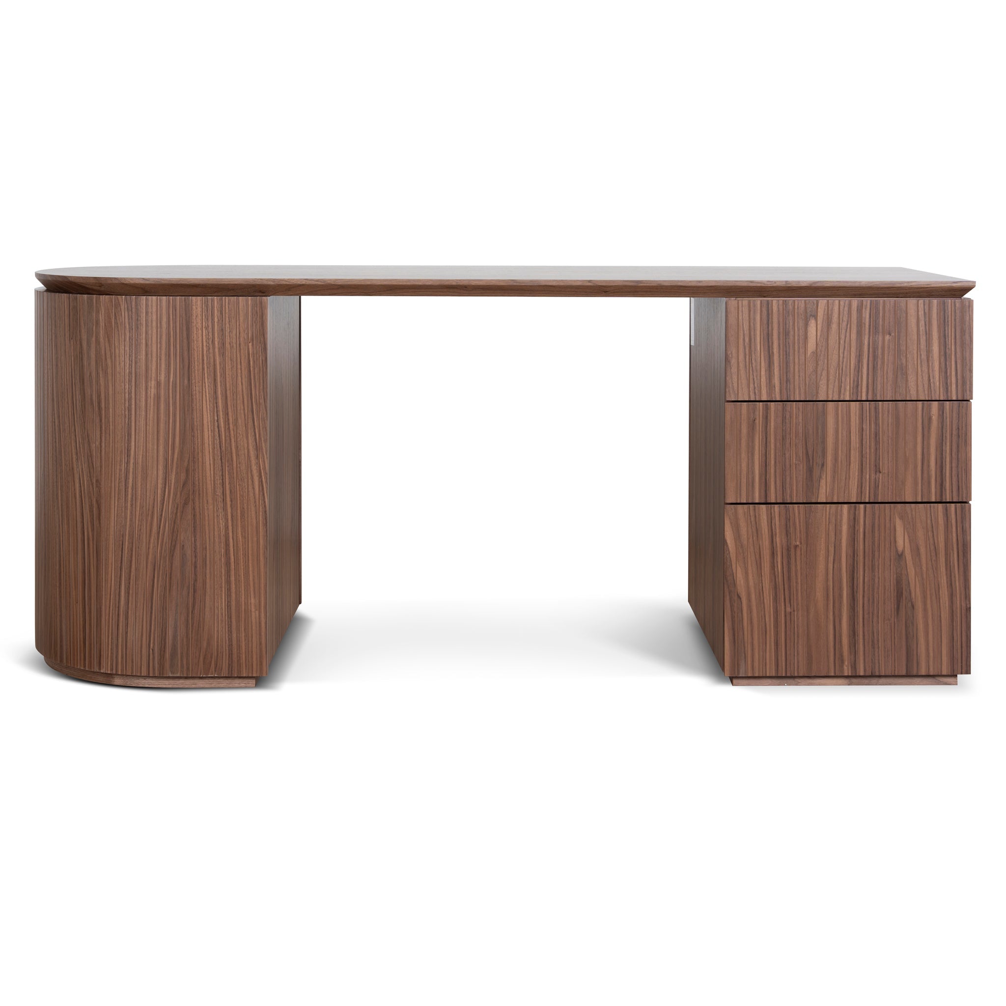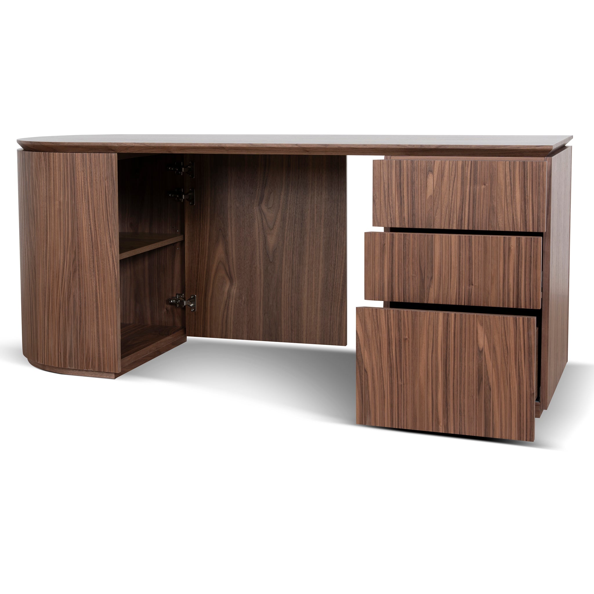 Engineered wood with rich walnut veneer construction 1.77m length Right-hand drawer configuration Smooth drawer fronts with clean silhouette Rounded base edges Weight Capacity: 50 kg Minor assembly required