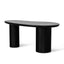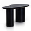 Engineered wood top and base with veneer Full black finish with water-based paint Bean-shaped tabletop design Visible wood grain patterns Cylinder-shaped legs with vertical wood panel Minor assembly required
