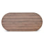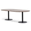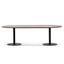 Melamine particle board top Oval-shaped table, 2.4 meters long Walnut finish Wood grain patterns 3 matte black steel legs Modern minimalist style Suitable for commercial use Weight Capacity: 200 kg Product is flatpack and requires two-person assembly