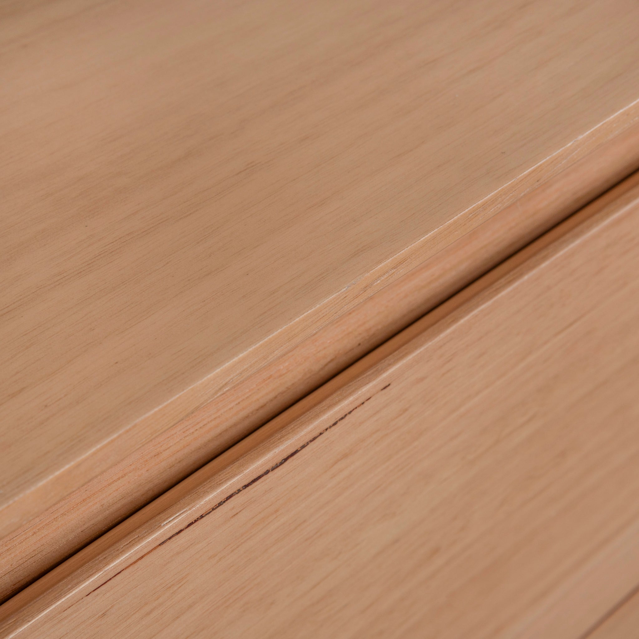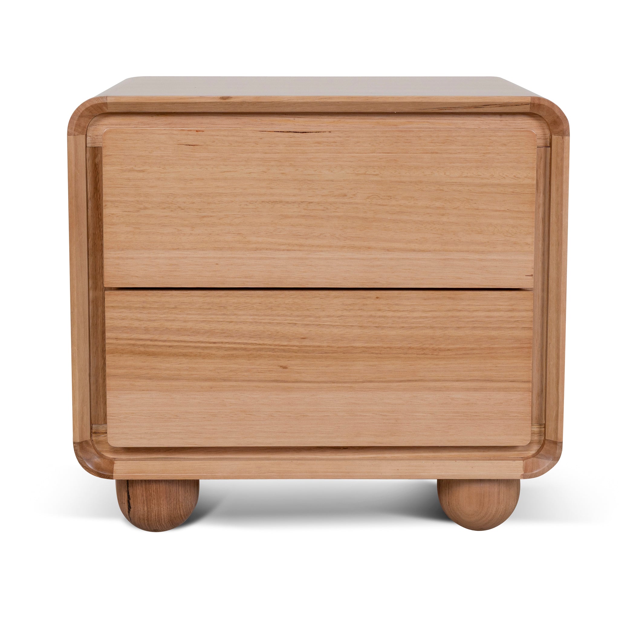 Messmate solid wood drawer fronts and legs Engineered wood top and sides with messmate veneer Messmate solid wood corners Natural wood grain patterns Soft rounded edges Seamless handle Two spacious drawers Complements a variety of interior styles Full extension runners Weight Capacity: Top: 20 kg, Drawers: 5 kg each Product comes fully assembled