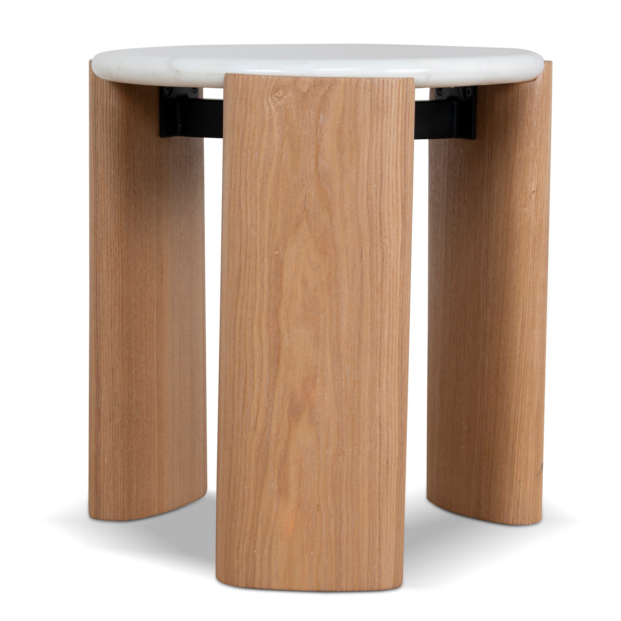 Carrara marble top with natural veining Cylindrical wood veneer legs Space-saving two-table configuration Soft rounded edges Complements minimalist and contemporary interiors Built for durability and lasting strength Weight Capacity: 50 kg Minor assembly required Note: Our marble table tops are a natural stone that each have their own unique imperfections and characteristics. Any variations in colour, texture, polish and pattern are not a fault and should be appreciated. Please note that polished marble is porous, so contact with liquids or hot beverages may cause the marble to mark. Make sure to wipe away any spills immediately using water or a mild cleaner. We recommend the use of placemats and coasters to further protect the integrity of the marble.