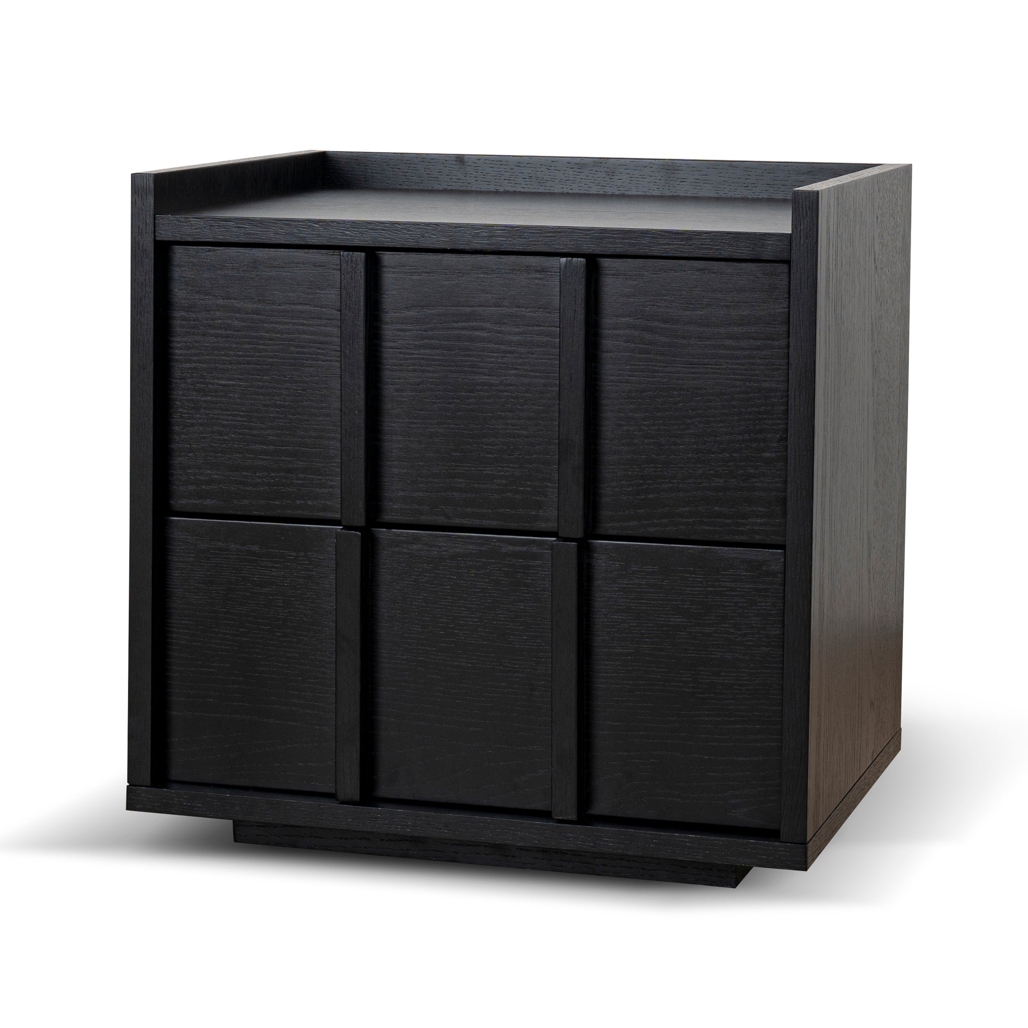 Engineered wood with a black veneer construction Black NC paint finish Cubic form adds bold structure Two spacious drawers Raised edge top Sleek plinth base Handle-free design Weight Capacity: 60 kg Flat-packed and requires assembly by two people