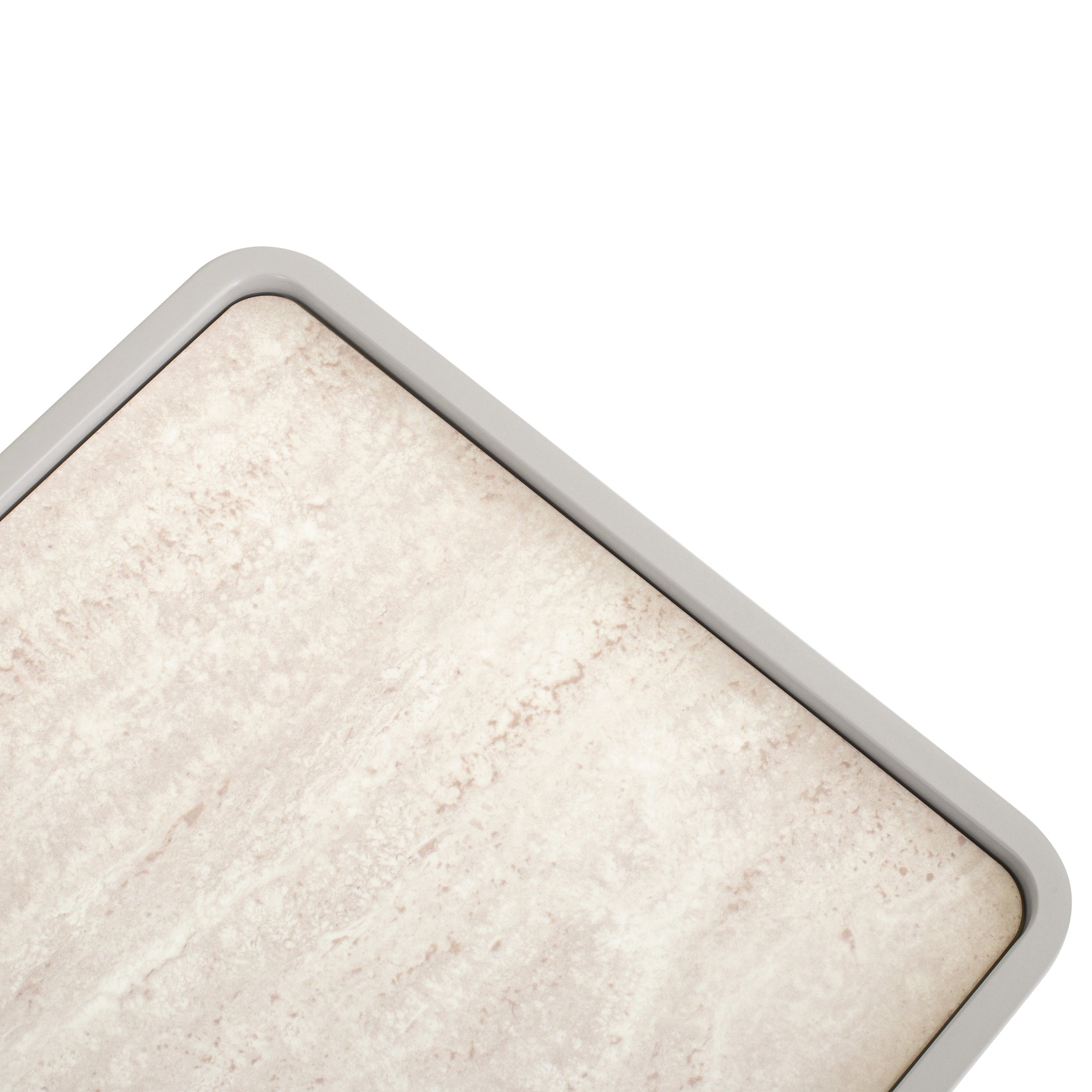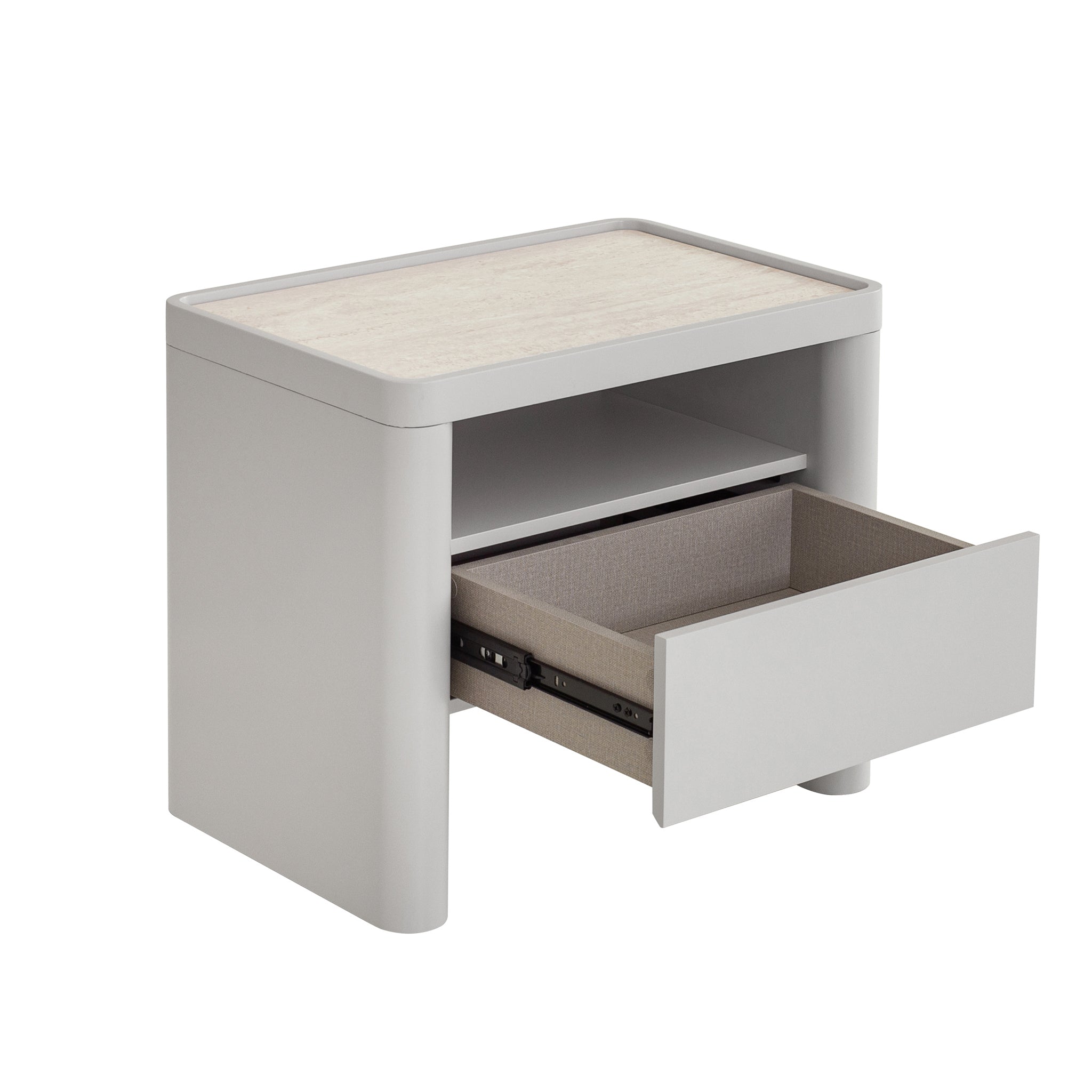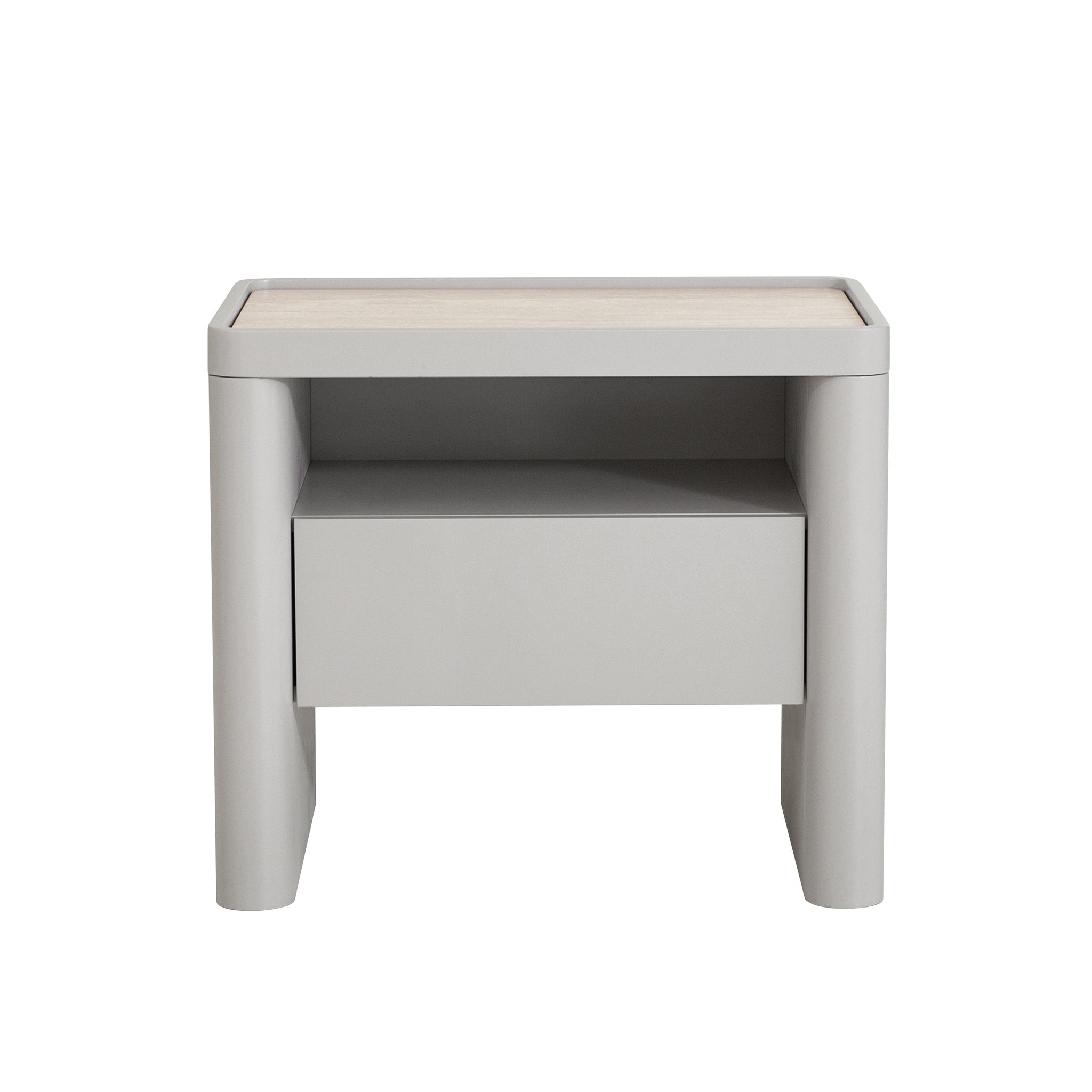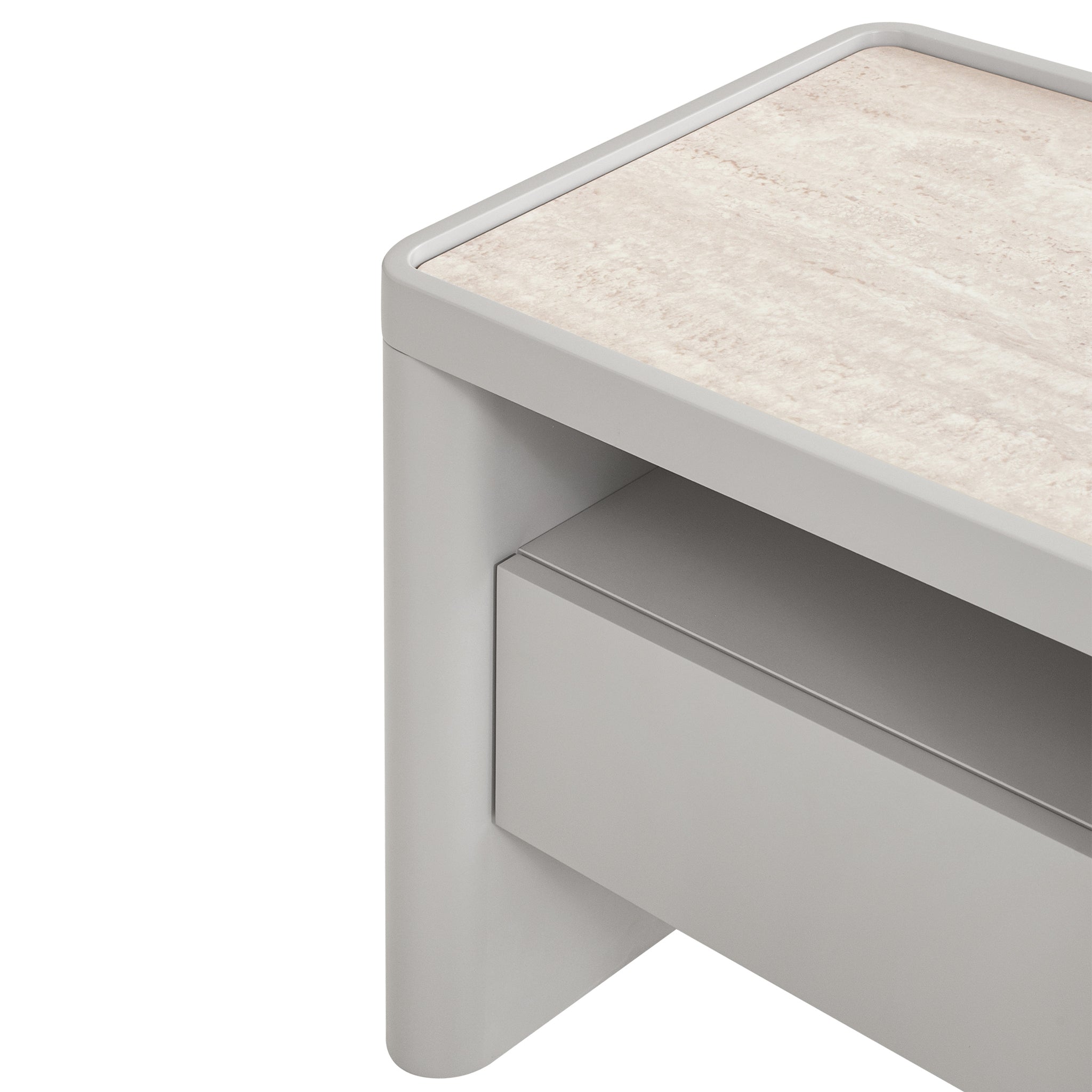 Travertine look tempered glass top Engineered wood legs, sides, and drawer front panels Melamine back and internal drawer panels Warm grey with a PU finish One spacious drawer and open shelf Rounded corners and legs Handle-free design Contrasting textures Weight Capacity: 50 kg Product comes fully assembled