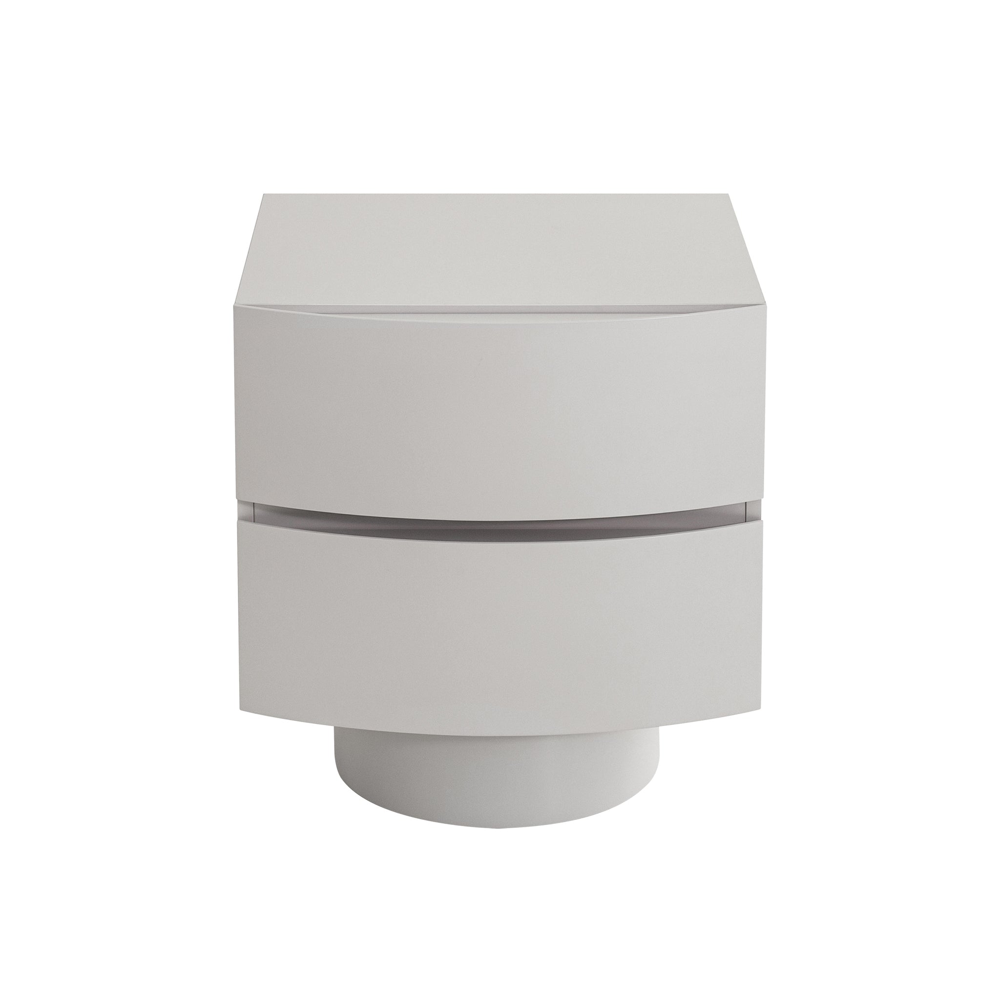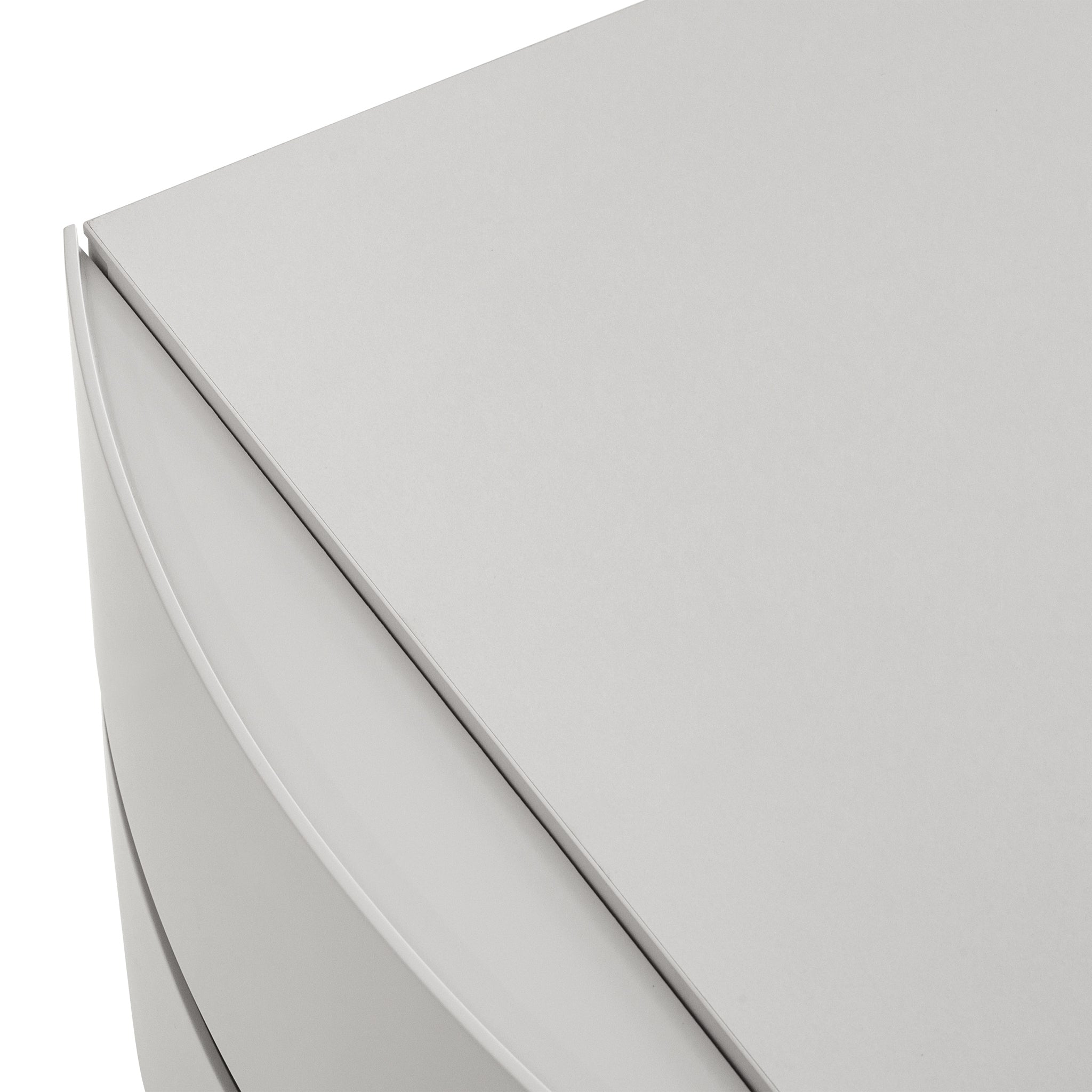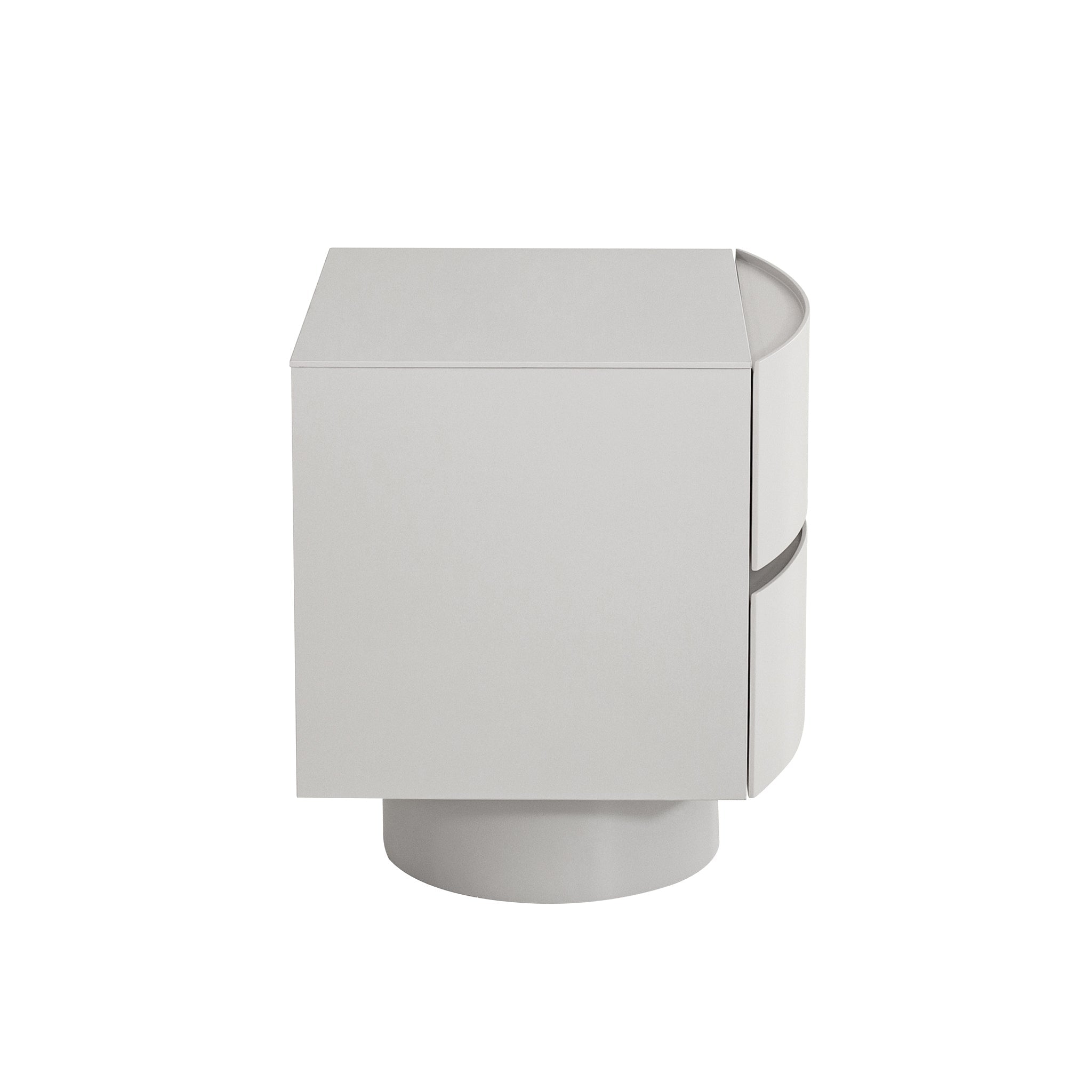 Engineered wood with a durable melamine finish body Engineered wood with natural veneer legs and drawers Warm grey tone with PU coating Sculptural silhouette with curved drawer fronts Handle-free design Bold cylindrical pedestal-style base Seamless drawer grooves Two spacious drawers Weight Capacity: 30 kg Minor assembly required
