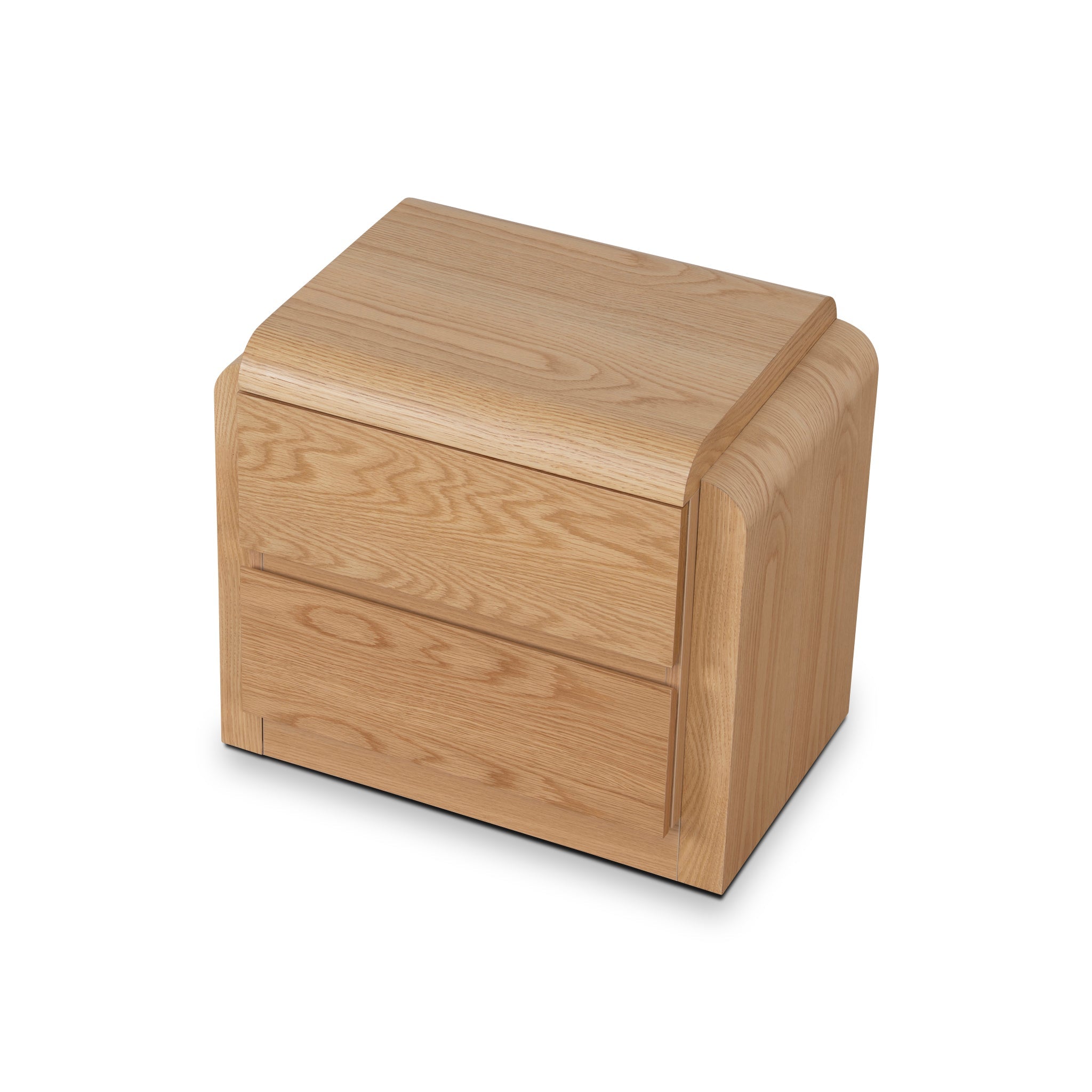 Engineered wood with natural veneer Melamine surfaces Veneered top, sides, and drawer fronts Rounded corners and edges Slight overhanging top Natural finish Two spacious drawers Smooth metal runners Weight capacity: 50 kg Product comes fully assembled