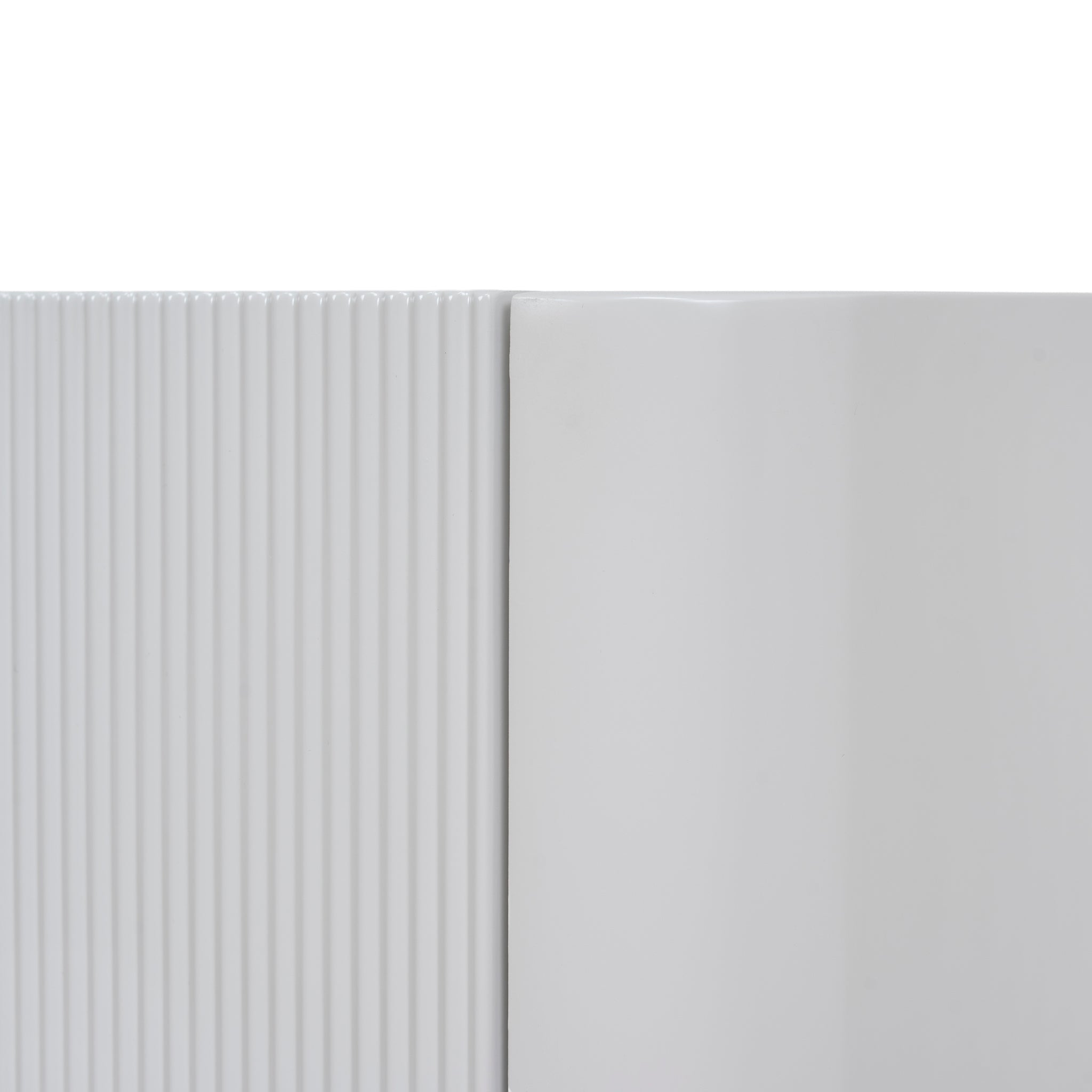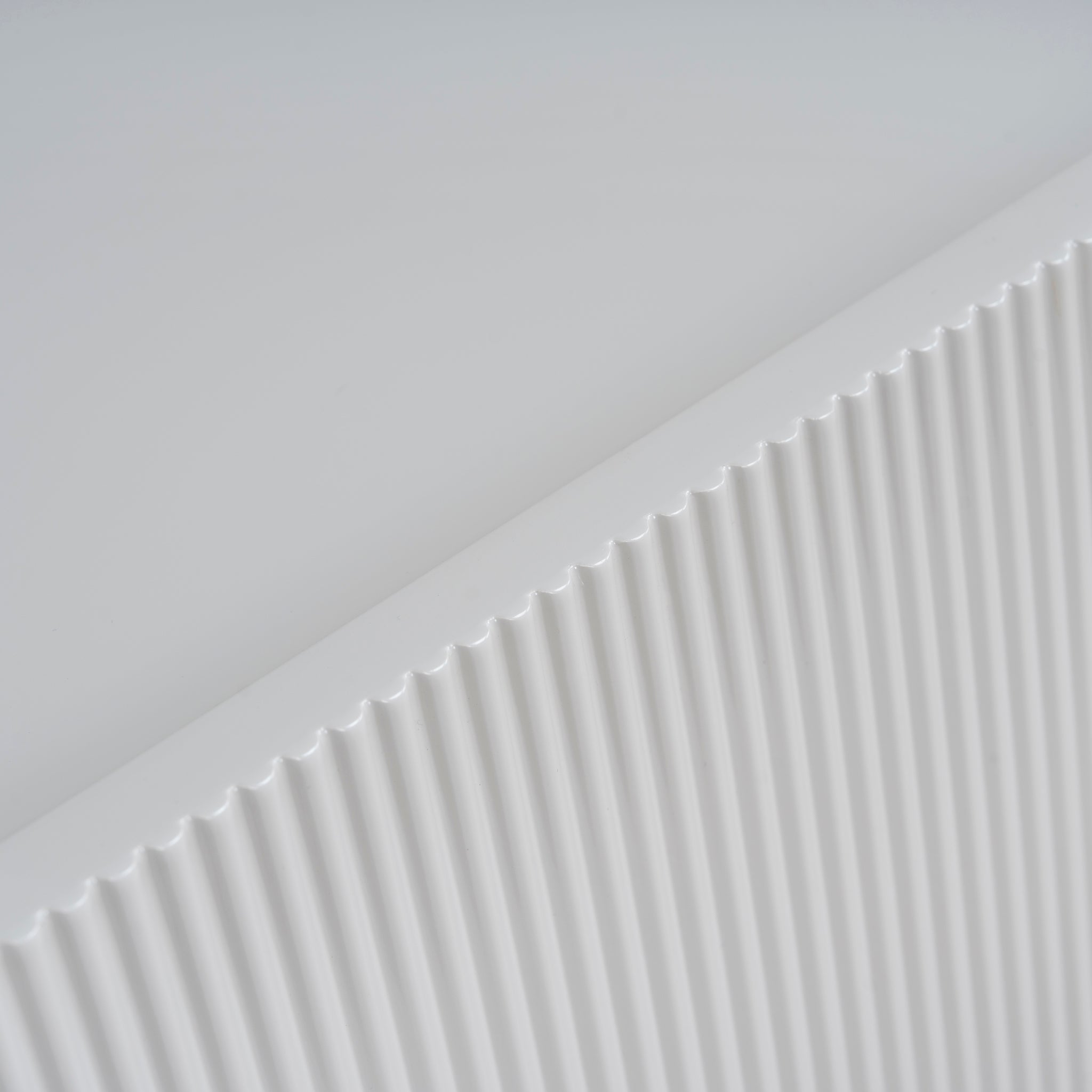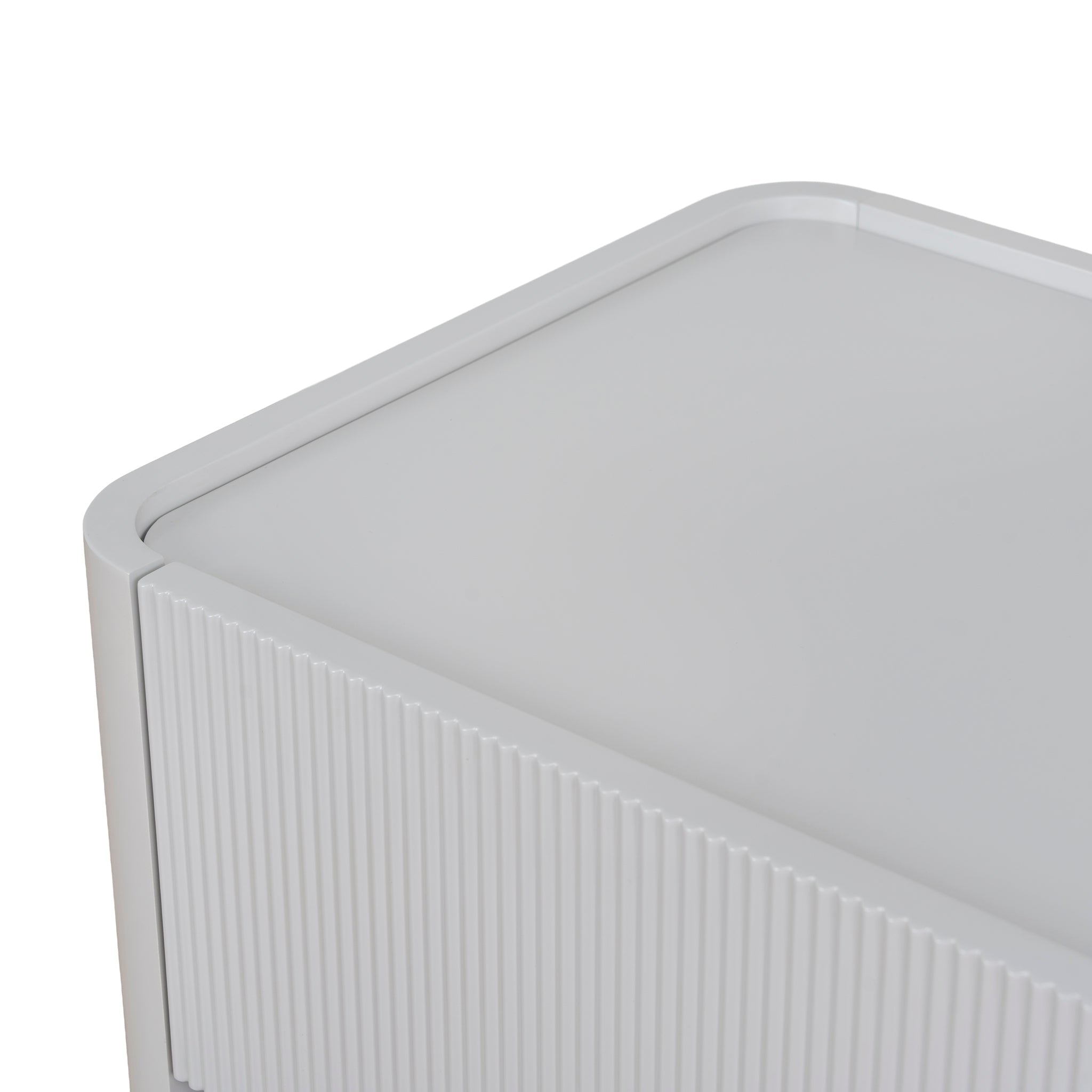 Engineered wood with warm grey veneer Melamine surfaces Gently curved edges Fine ribbed detailing Raised edge Clean, uncluttered façade Two spacious drawers Smooth metal runners Solid block-style legs Weight capacity: 50 kg Minor assembly required