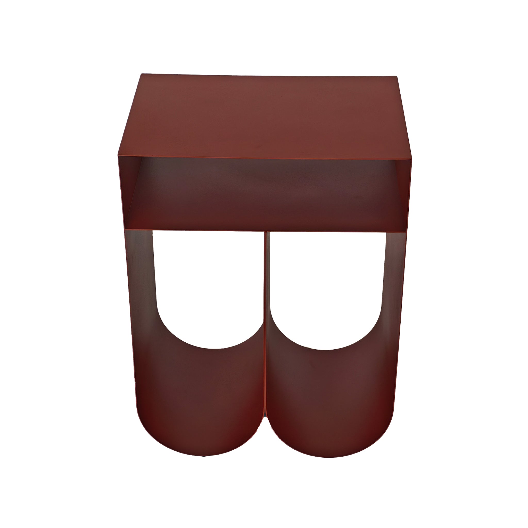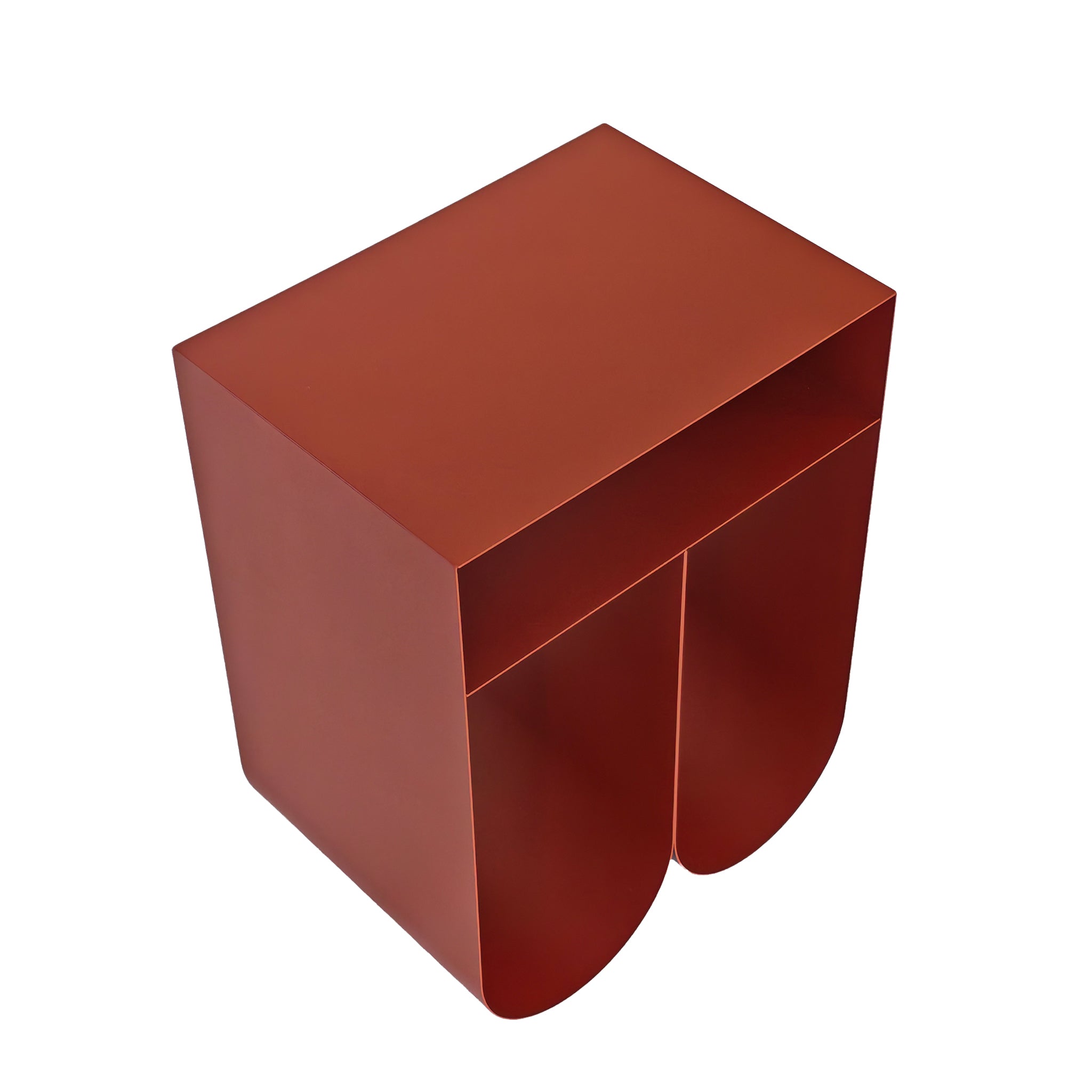 Iron metal construction Burgundy red powder-coated finish Compact 35.5cm size perfect for small spaces Artistic arched base design Flat tabletop ideal for drinks, books, or décor Integrated open shelf Weight capacity: 10 kg Product comes fully assembled