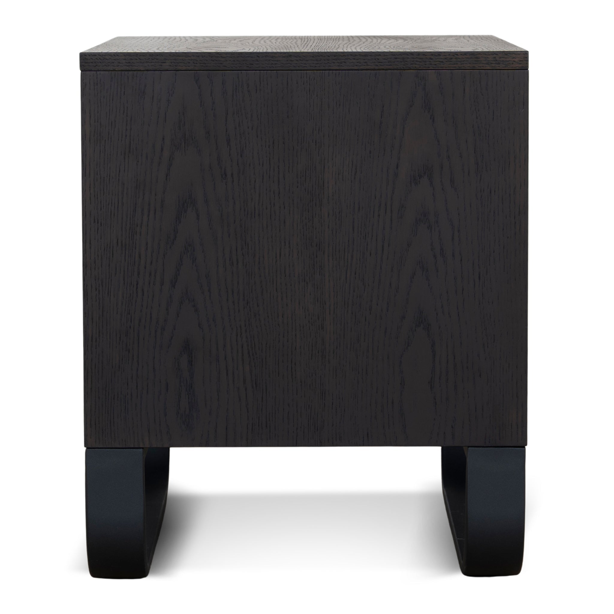 Engineered wood with dark walnut veneer Smooth surface with natural grain texture Black powder-coated U-shaped metal legs Matte sheen enhances dark walnut tones Rectangular form with clean lines Two handle-free drawers Smooth and quiet drawer glide Minor assembly required
