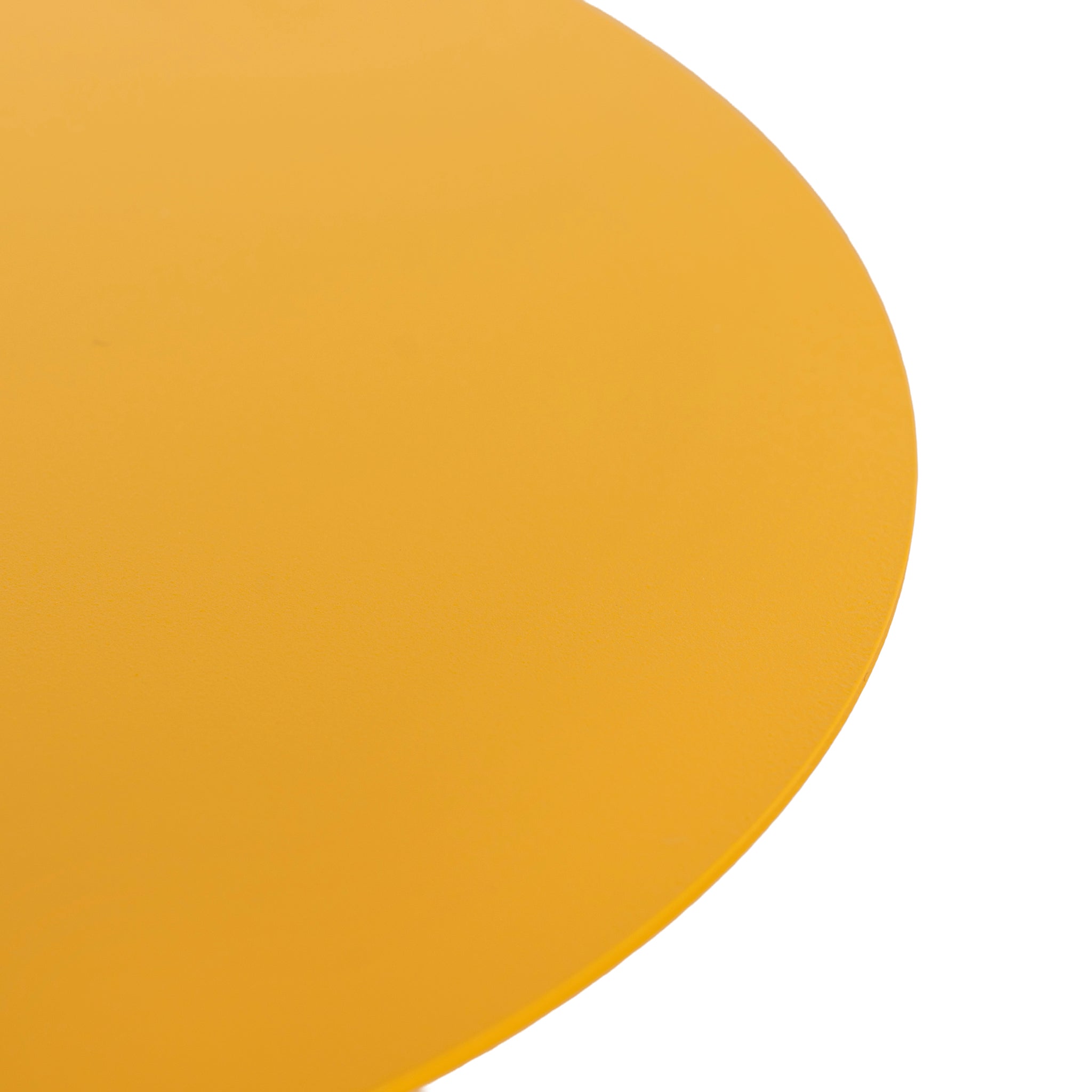 Iron metal construction Powder-coated sandy mustard finish Seamless modern one-piece design Round top with asymmetrical curved base Arc cutout Soft edges and clean lines Compact size ideal as an accent piece Weight Capacity: 10 kg Product comes fully assembled