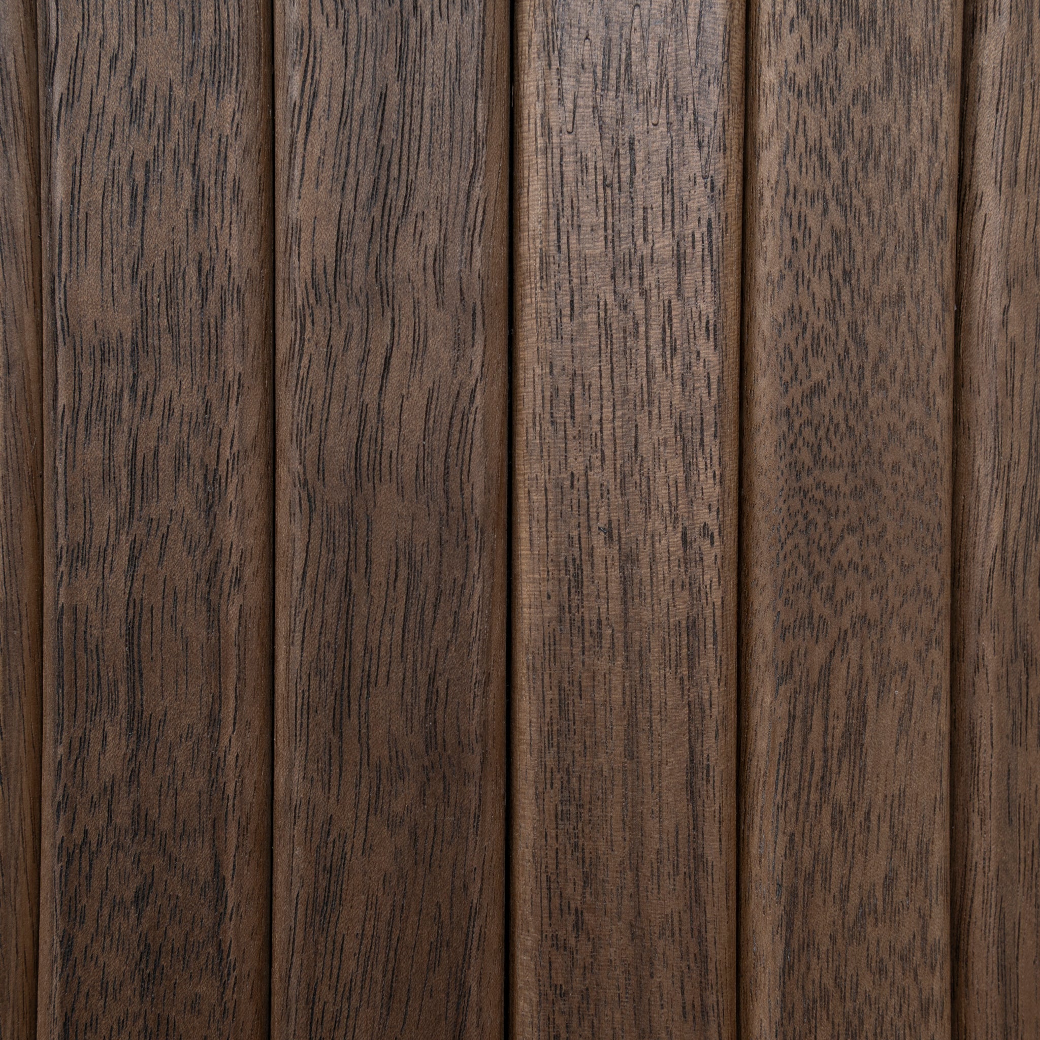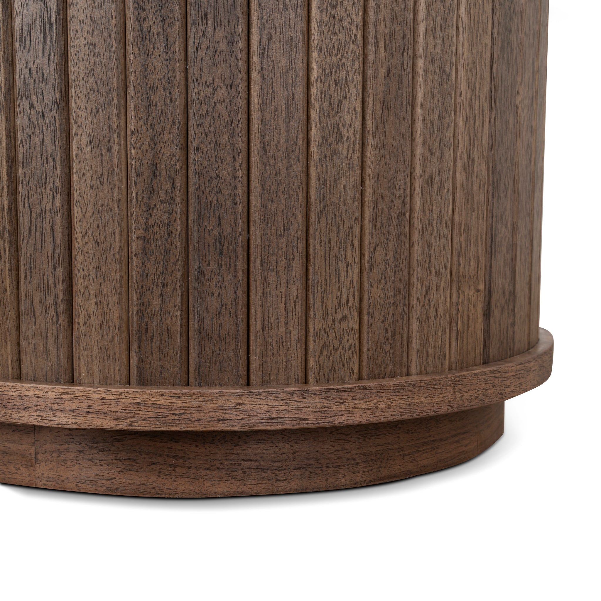 Engineered wood with a natural veneer finish Walnut finish Rounded drum shape Vertical fluted slats Door slides 180 degrees Raised-edge base Weight Capacity: 80 kg This product is supplied flat-packed and requires assembly by two people