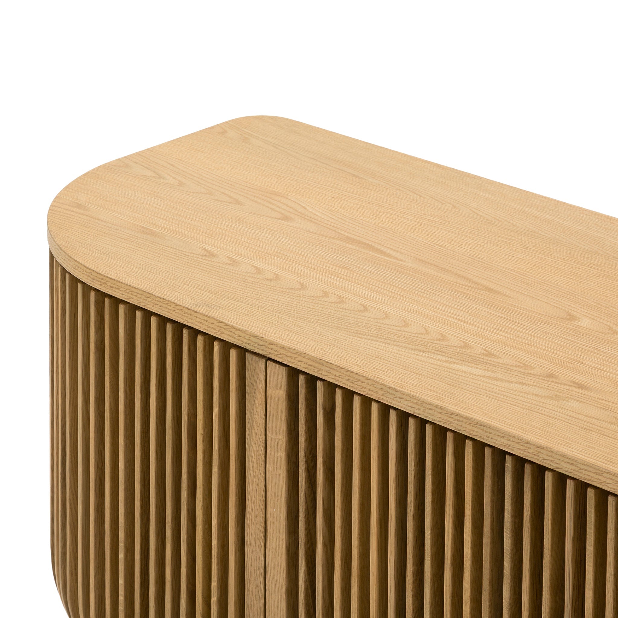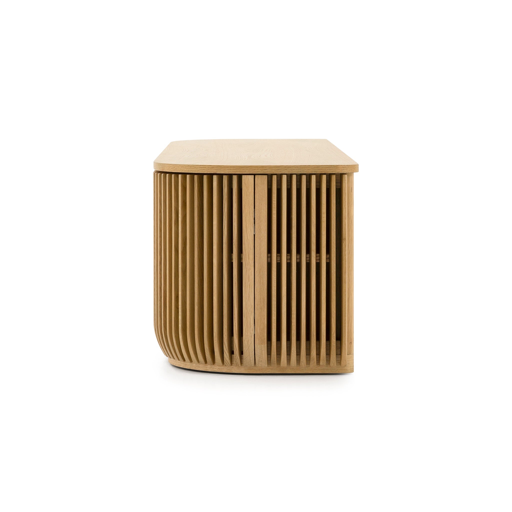 Engineered wood with natural oak veneer NC natural oak finish Vertical slatted façade Curved corners Compact yet functional design Ample internal shelving Low-profile silhouette Product comes fully assembled