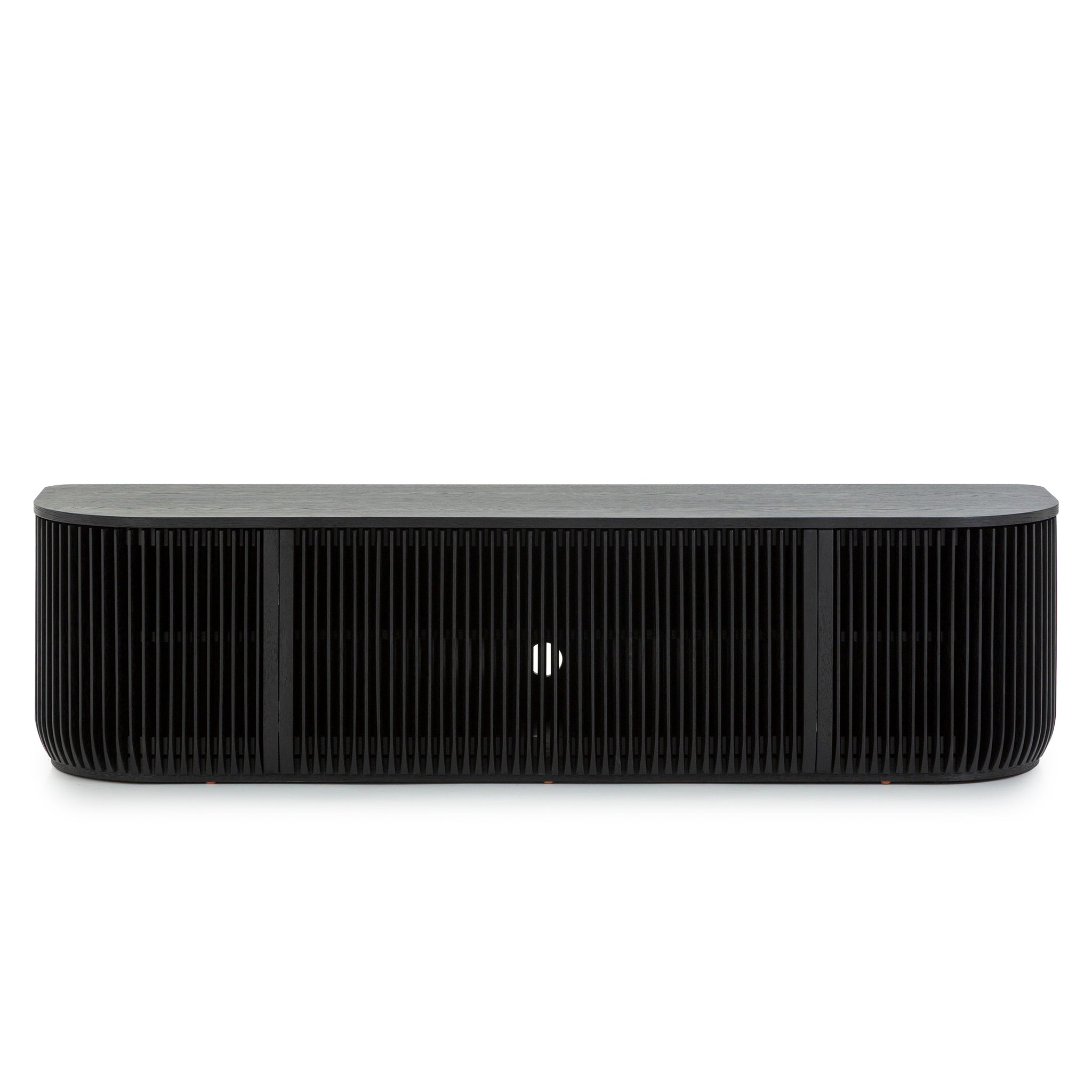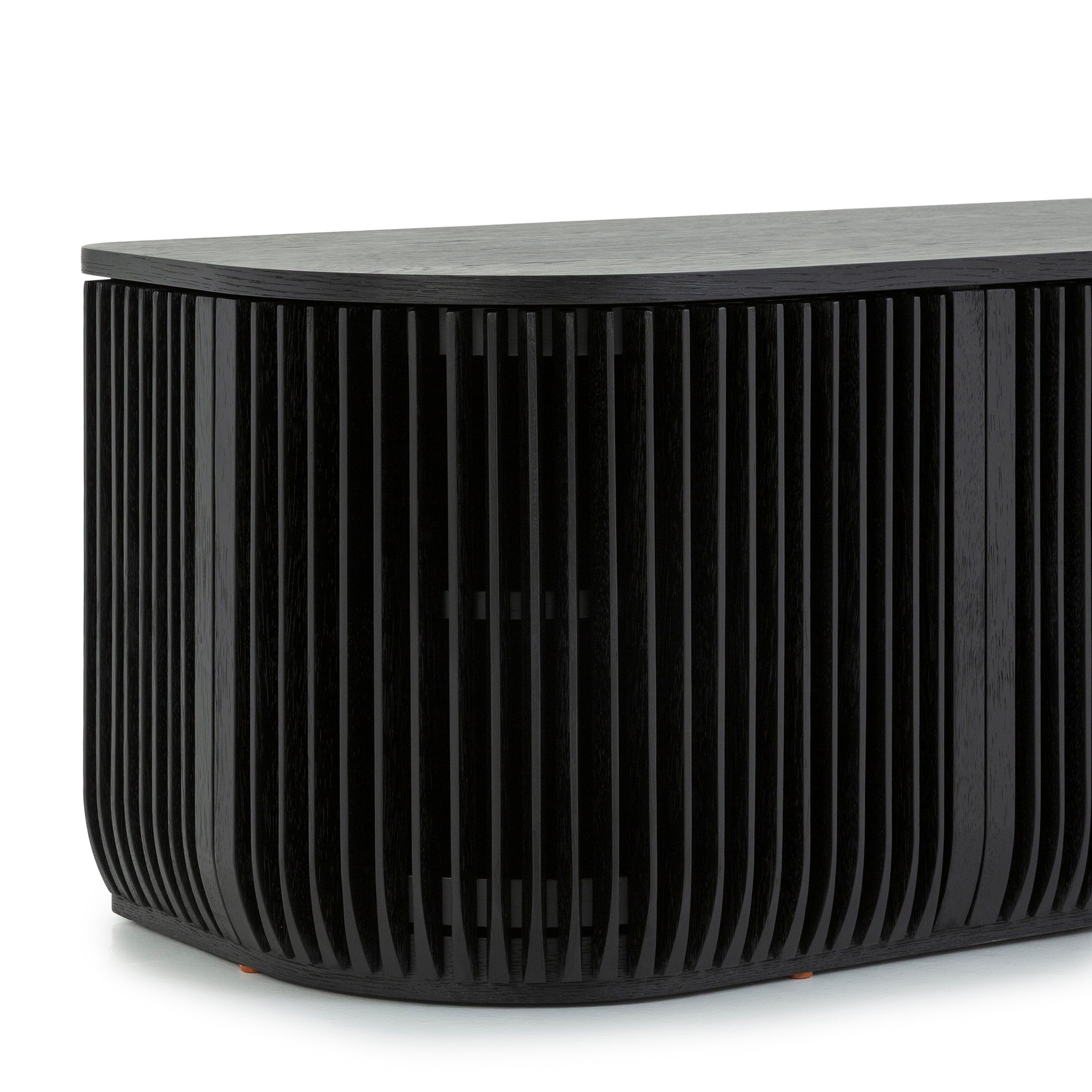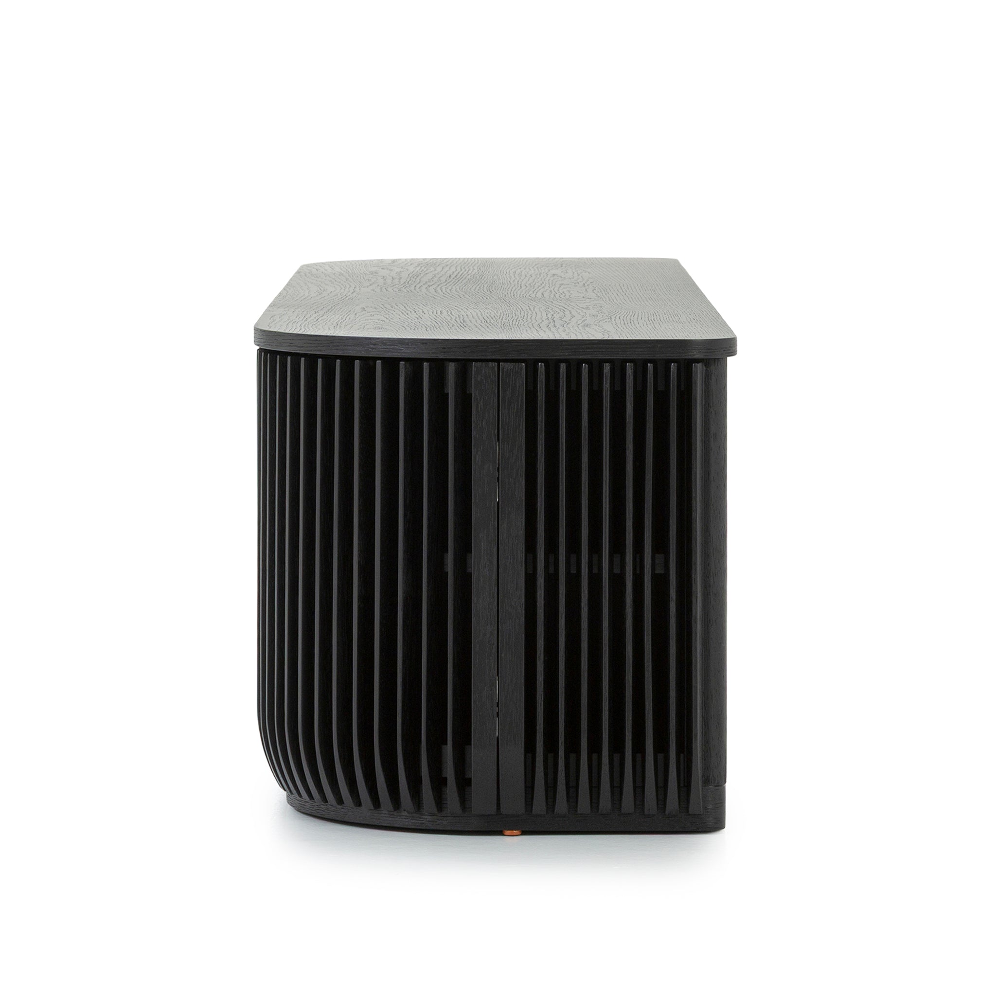 Engineered wood with oak veneer NC black stain oak finish Vertical slatted façade Curved corners Compact yet functional design Ample internal shelving Low-profile silhouette Product comes fully assembled