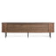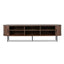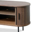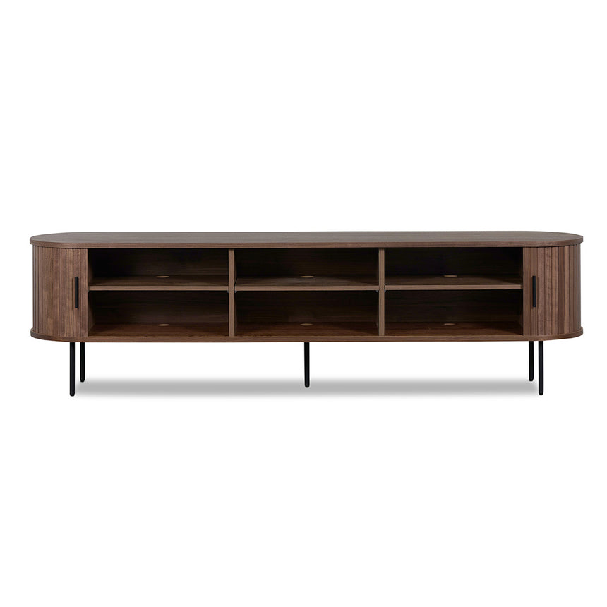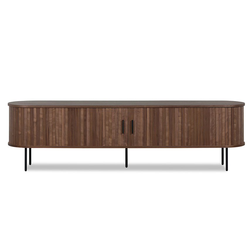 Walnut finish engineered wood Sturdy black metal legs Lacquered finish Oval top with curved edges Side sliding doors with matte black handle 6x cable management holes Weight Capacity: 100 kg Product is flat packed and requires 2-person assembly
