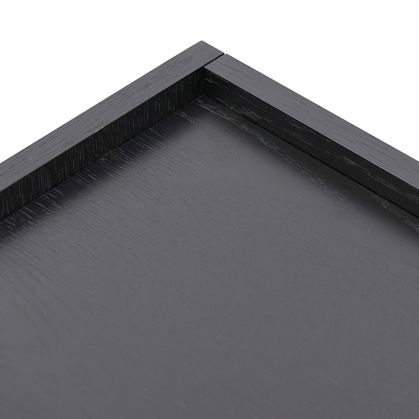 Engineered wood with veneer in full black 2 side cabinets 2 central cupboards with drop-down doors Sturdy black metal legs 4 cable management holes Push-to-open doors Weight Capacity: 100 kg Product is flat packed and requires two-person assembly