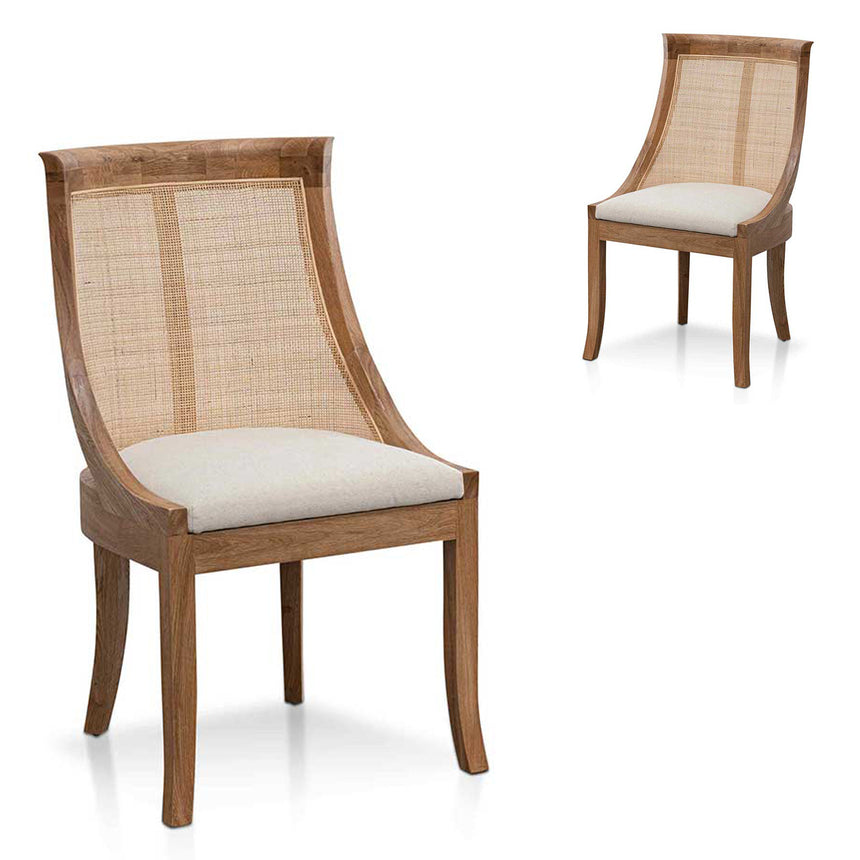 Seat upholstered in a 100% beige polyester fabric Frame in a durable pine wood construction Flared legs in rubber wood build Seat rest includes web suspension and foam filling Rattan backrest with exposed frame Backrest curves inwards to create wingback Weight capacity: 150KG Product is fully assembled