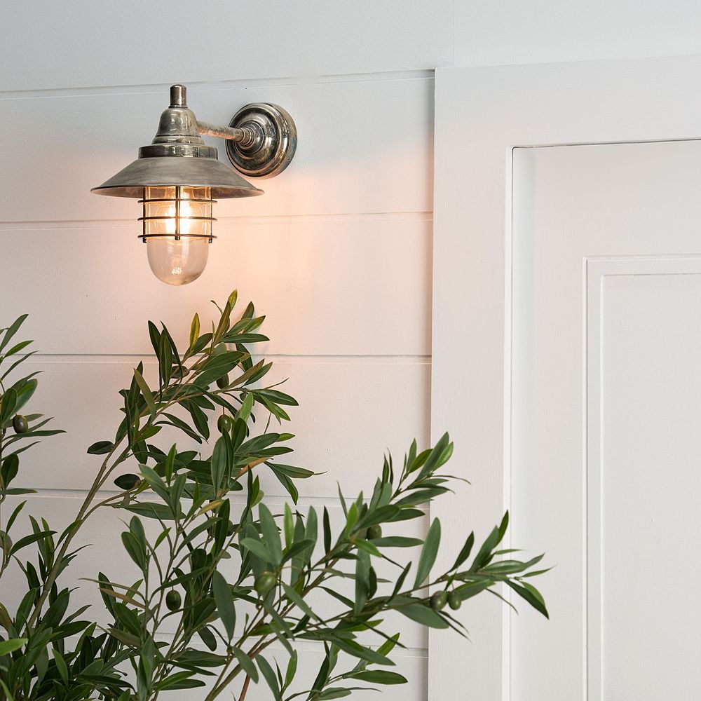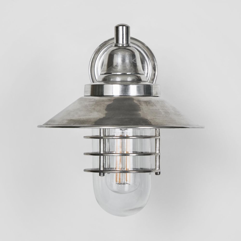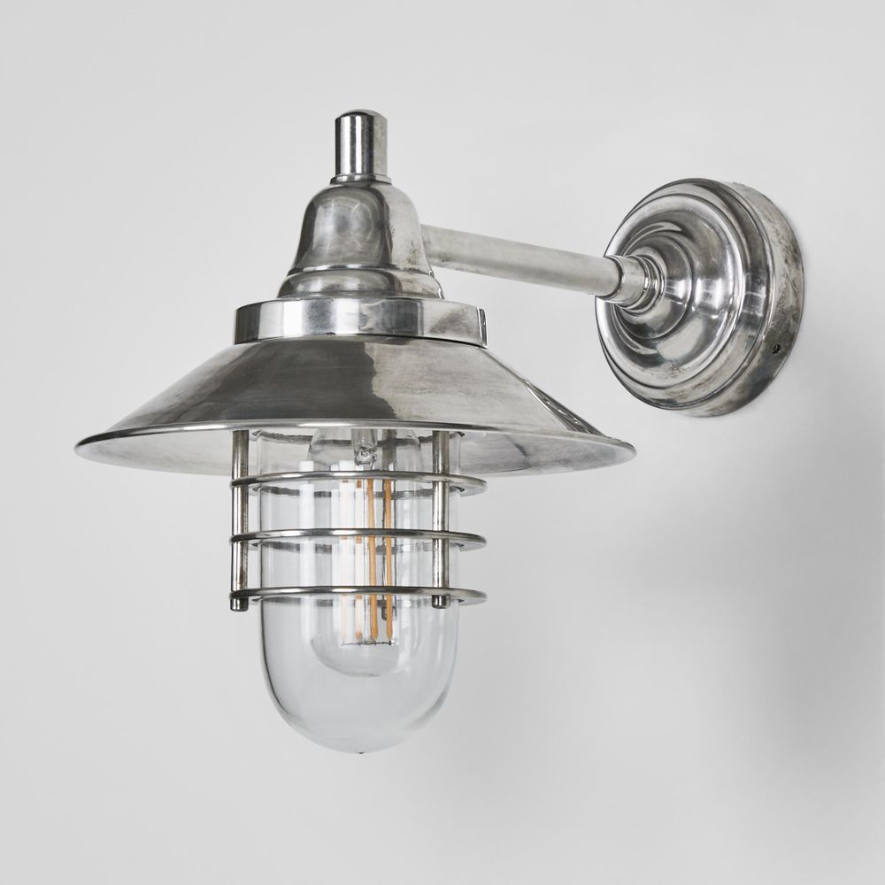 Introducing our Clark Wall Lamp Antique Silver, the perfect addition to any indoor or outdoor space. This IP-rated 54 outdoor wall-sconce features a clear glass and brass metal cage, making it suitable for both indoor and outdoor use. Its lantern style design is ideal for outdoor garden lamps, patios, and entryways, but can also be used in bathrooms as side mirror lights to complement any industrial, rustic, or loft-style décor.