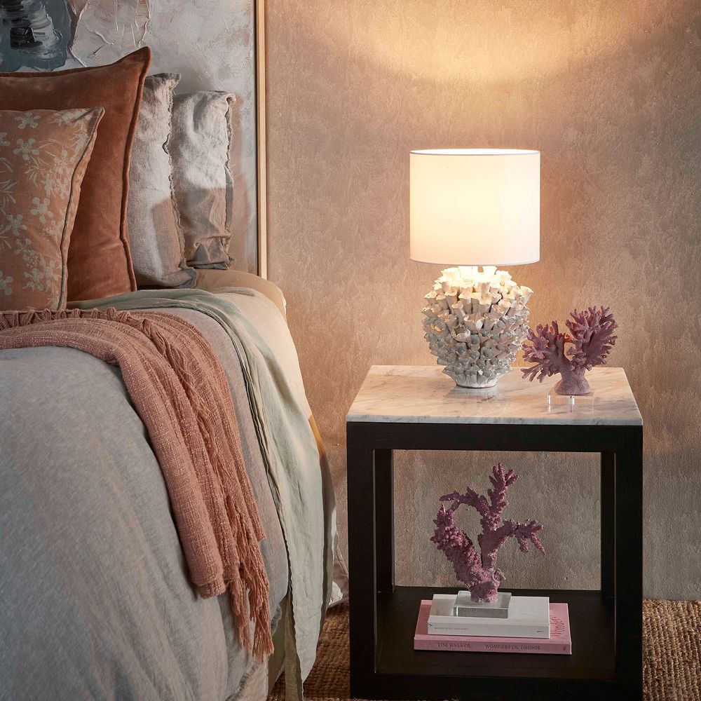 Londolozi Table Lamp W/Shade Cream is a charming and classic coral porcelain table lamp that is hand painted with a classic pattern. It is the perfect addition to any living or family room, adding a coastal feel with its sea-shell design. The lamp comes with a white cylinder shade, creating a soft and elegant lighting.