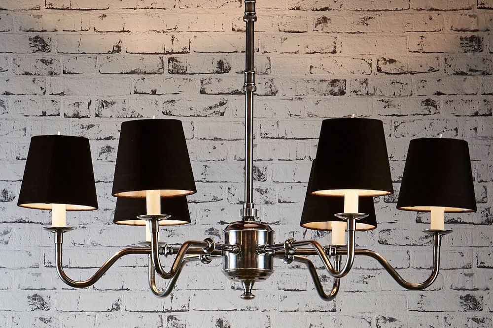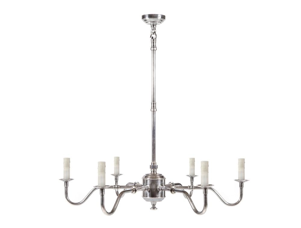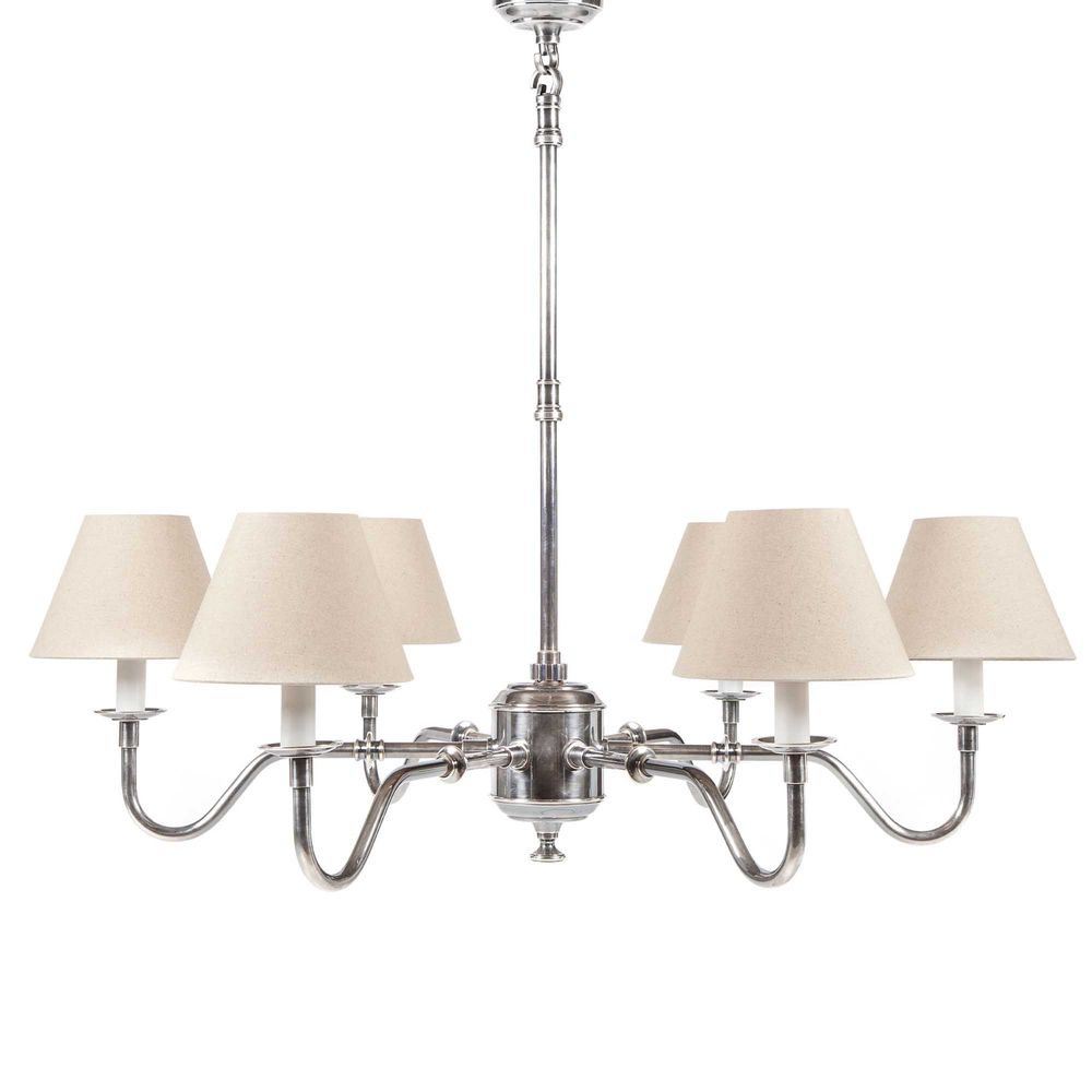 Introducing our Prescot 6 Arm Chandelier Base in Antique Silver. This traditional chandelier is made of solid brass and comes in three stunning antique finishes: brass, silver, and bronze. The light is suspended on three metal rods and can be adjusted for height by removing rods as necessary during installation. We recommend using a 7 or 8 inch shade on the bottom diameter for this chandelier. To view our selection of lamp shades, please click on the links below: 7 inch 8 inch