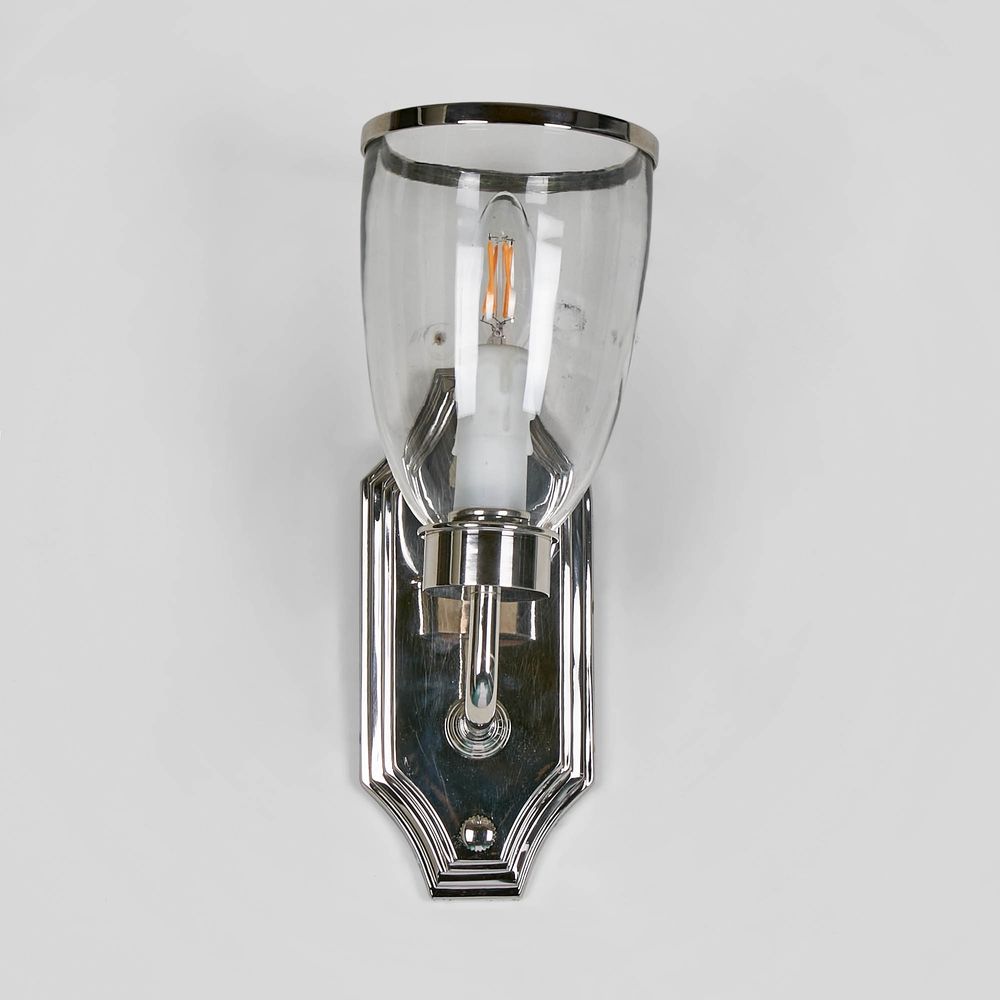 Introducing our Westbrook Sconce Nickel W/Glass Shade, a classic and beautiful wall sconce that will add a touch of elegance to any room. The clear glass and metal rim on top create a timeless look, while the candle drip plastic inside the glass adds a decorative touch and supports the bulb for perfect ambient lighting. This versatile light fixture can be installed in both up and down positions, making it perfect for any indoor space.
