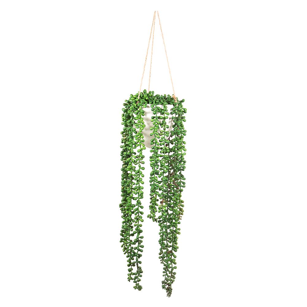 Cascading strands of pearl-shaped buds nestled amidst lush greenery, gracefully draping from a sleek pot, creating a luxurious and captivating display that's sure to dazzle. Suspended from a sturdy pot, these strands elegantly sway, adding movement and charm to any space. Whether hung in a corner to create a focal point, displayed on a mantelpiece to add sophistication, or used as a centerpiece for special occasions, this exquisite decor piece is bound to steal the show.