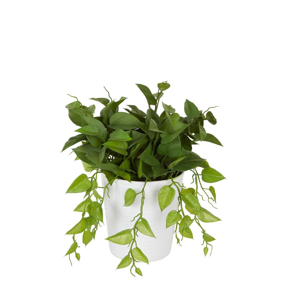 Introducing the Leaves in White Plastic Pot 35cm, a stunning addition to any room. This plant features a cluster of soft leaves with green tendrils, elegantly overhanging a white pot. The arrowhead shaped leaves have intricate vein detailing, adding a touch of sophistication to the overall design. Standing at 35cm tall, this plant is the perfect space filler for any empty corner or shelf. Made of plastic, iron wire, and foam, this plant is both durable and lightweight. Its dimensions of L 35cm x W 35cm x H 35cm make it a versatile piece that can fit into any space. Available in a crisp white color, this plant will effortlessly blend in with any home decor. Shop now at Luxury Interiors Australia for the best in home decor and modern furniture.