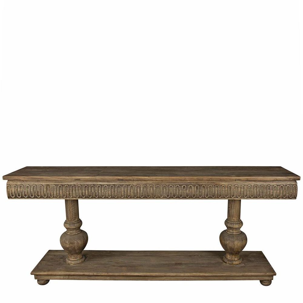 Prepare to add a touch of whimsy to your space with our Palmer Console. Crafted from wood with a rich brown finish, this console boasts a unique design with flowing wiggly lines adorning the skirt. It features a convenient bottom tray, slightly smaller than the surface, perfect for storing your favorite books or decorative items, with spindle legs elegantly placed within. Whether placed in your entryway, living room, bedroom, or hallway, this console promises to be both functional and eye-catching.