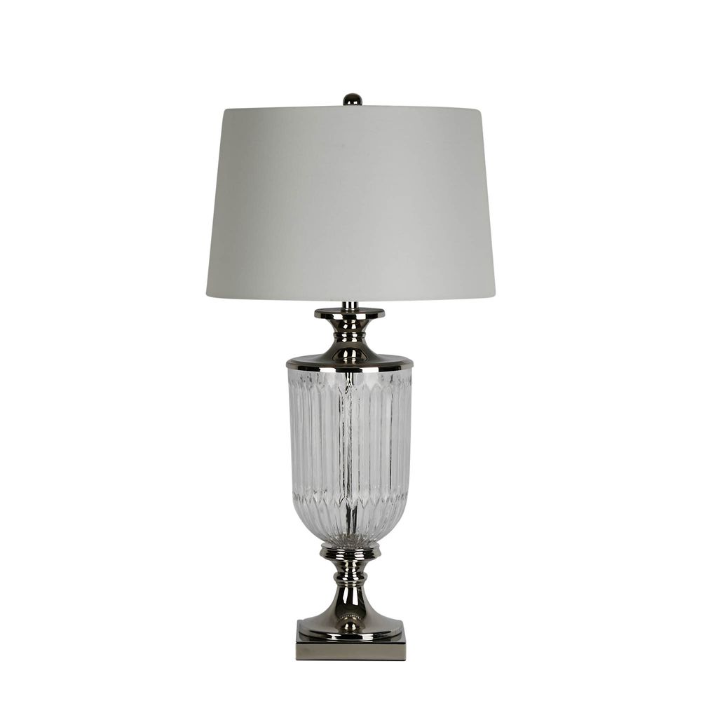 Introducing the Bellevue Glass Nickel Lamp With Natural Linen Shade, a must-have for any elegant and sophisticated space. This stunning lamp features a trophy-shaped base made from glass and iron, finished with a natural linen drum shade. Its regal design adds a touch of luxury to any room, making it the perfect addition to your home decor.