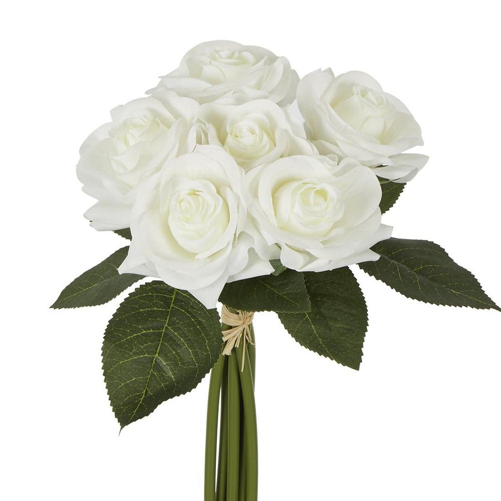 Get ready to be swept off your feet by the romantic allure of our artificial Rose Bouquet in White with new and hyperrealistic real touch technology. This stunning bouquet boasts white blooms with ruffled petals, elegantly accompanied by dark green serrated leaves. Whether you place it in a vase to adorn a cozy nook, accentuate a table centerpiece, or add a touch of elegance to weddings and events, this bouquet is sure to steal the spotlight. They're long-lasting and hypoallergenic, so you can enjoy their beauty without any sneezy setbacks. And with no wilting or unpleasant odors, they're the cost-effective, hassle-free solution to your floral needs.
