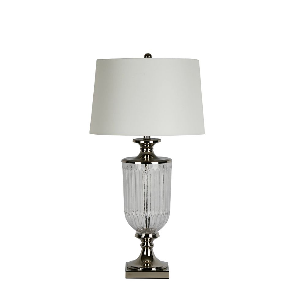 Introduce a touch of luxury to your space with our Bellevue Glass Nickel Lamp With White Linen Shade. Made from glass and nickel, the base exudes sophistication, perfectly complemented by the crisp linen shade. Elevate your decor game by styling these lamps in pairs for symmetrical perfection, whether on bedside tables, mantelpieces, sideboards, or any surface in need of a touch of elegance.