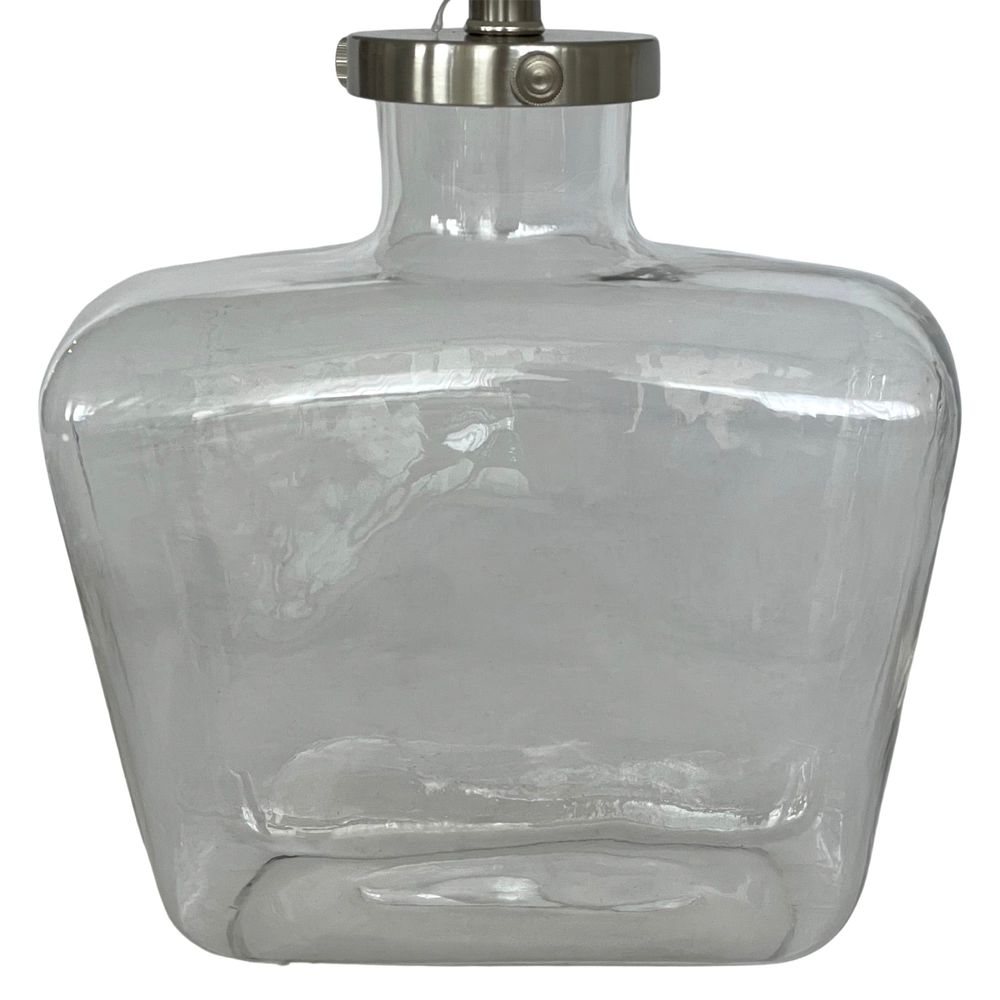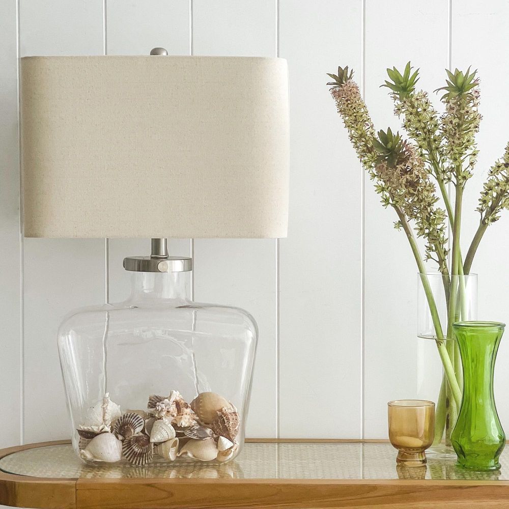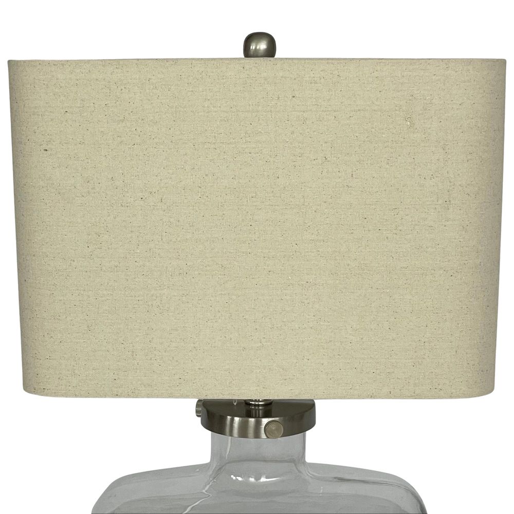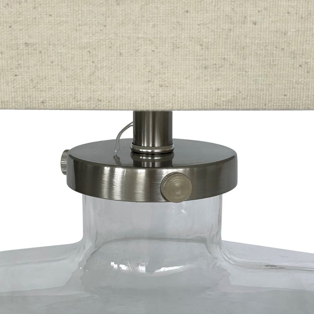 Introducing the Fillable Bottle Lamp W Linen Shade, a versatile and stylish addition to any home. This lamp is perfect for your guest room, living space, or hallway console, seamlessly blending in with any decor. Its understated design features a modern clear glass base with polished metal accents, topped off with a coordinating fabric drum shade.