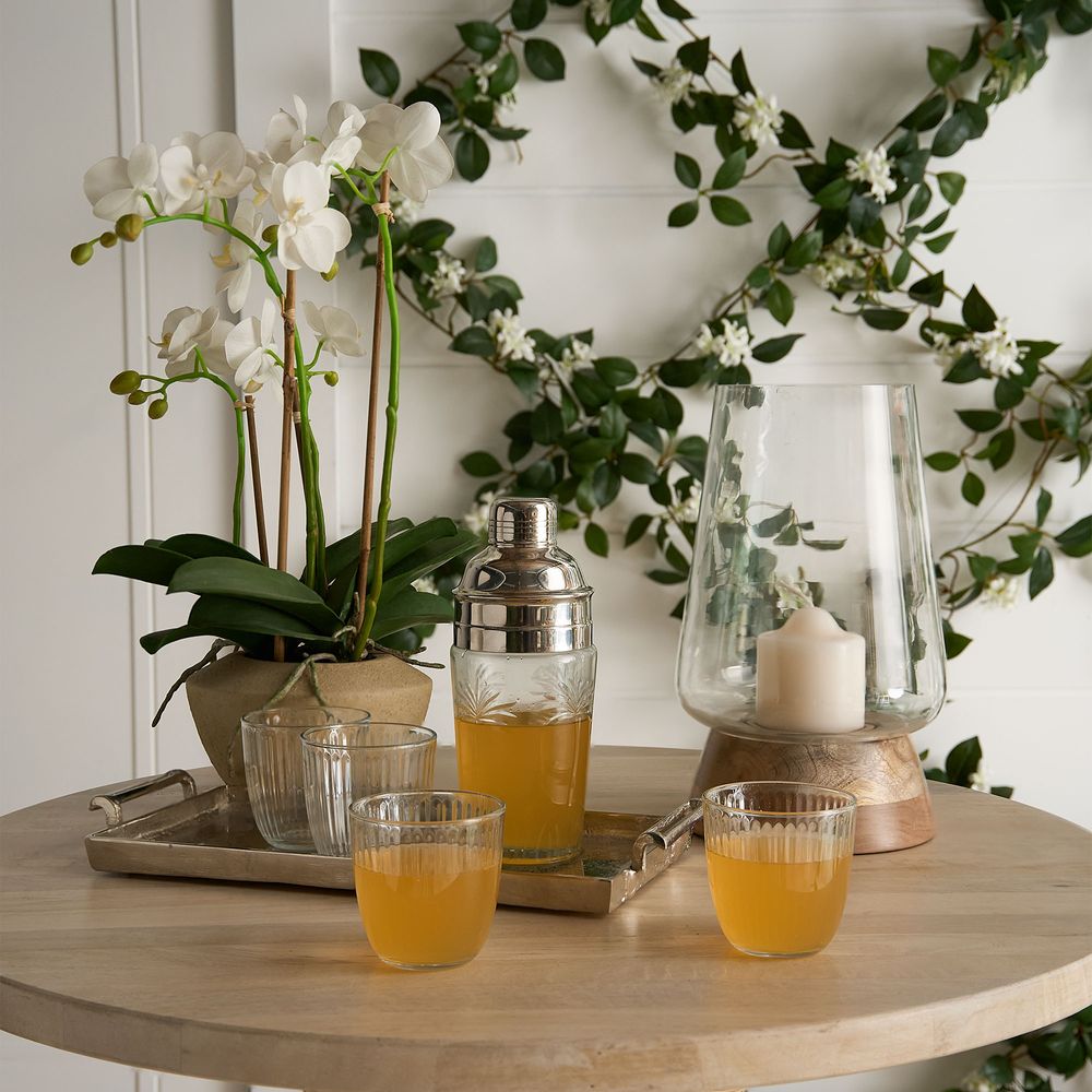 A classic Hampton`s barware collection, crafted in the finest quality glass, the Palm barware range features an etched Palm motif and polished nickel hardware. Complete the set with the cocktail shaker, two sizes of decanter, and ice bucket on a silver tray for an elegant, coastal entertaining statement. Waterproof and food safe, this serveware range will stand the test of time.